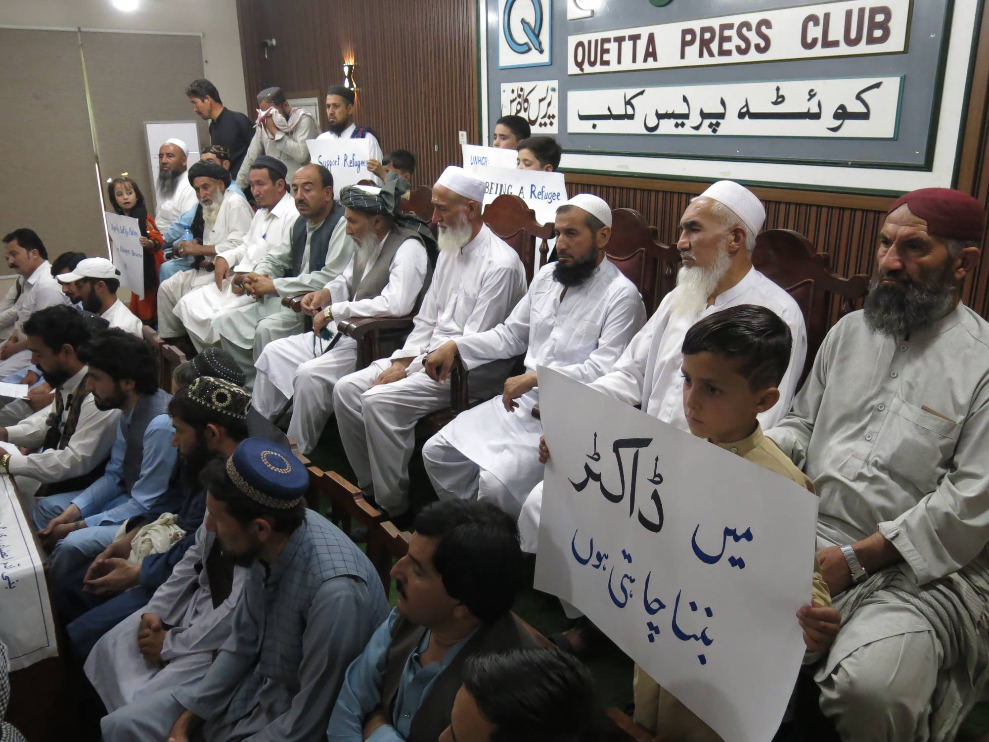 لاجئون أفغان بباكستان بينهم أطفال يرفعون لافتات خلال احتجاجهم في «نادي كويتا للصحافة» بكويتا عاصمة إقليم بلوشستان يوم 25 أغسطس 2025... تأتي هذه المظاهرة مع اقتراب الموعد النهائي يوم 1 سبتمبر المقبل لإعادة أكثر من 1.3 مليون أفغاني موثقين رسمياً ويعيش كثير منهم في البلاد منذ عقود ولديهم أعمال قائمة وأطفال يدرسون بمدارس محلية ويطالبون بتمديد الموعد النهائي لإدارة عودتهم (إ.ب.أ)