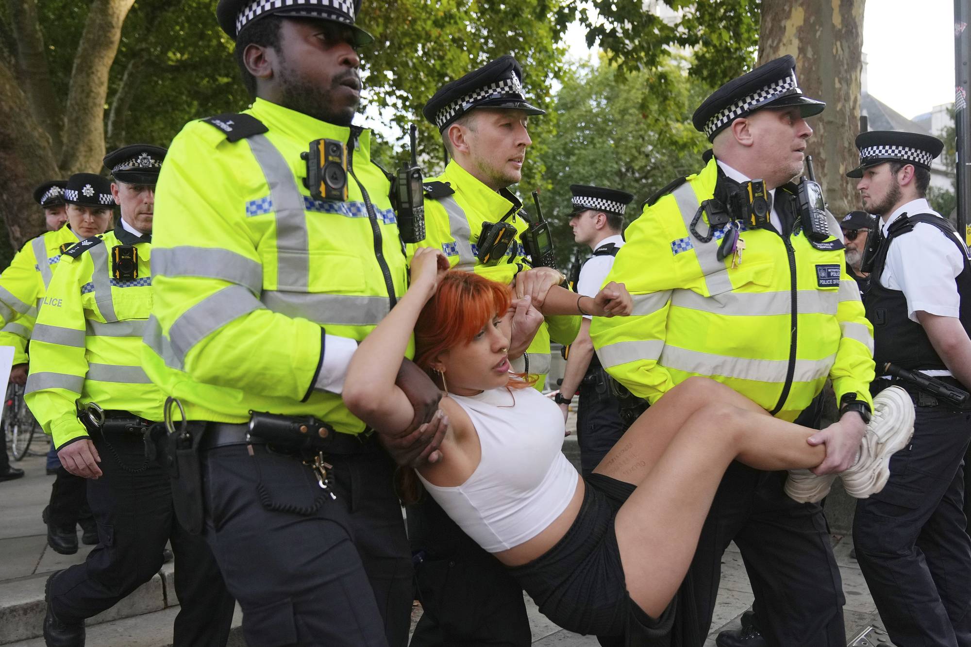 ضباط شرطة يحملون إحدى مؤيدات مجموعة «فلسطين أكشن» في لندن (أ.ب)