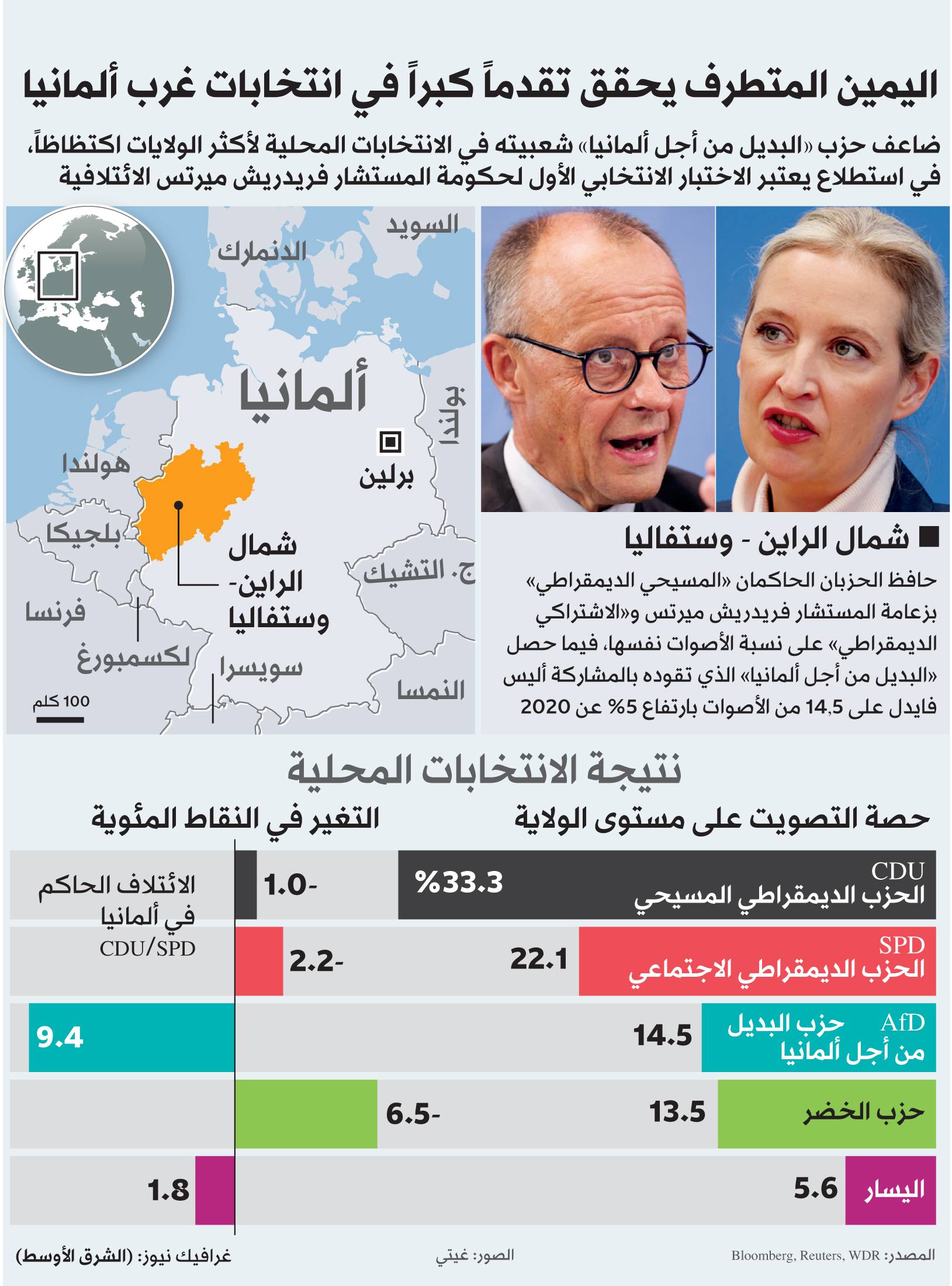 وأظهرت الانتخابات المحلية ولاية شمال الراين فستفاليا، أكبر ولاية ألمانية بعدد ناخبين يقارب 14 مليوناً من أصل 60 مليون ناخب في أنحاء البلاد، أن حزب «البديل من أجل ألمانيا» ضاعف أصواته بثلاث مرات منذ الانتخابات الأخيرة قبل 5 سنوات. وحقق الحزب اليميني المتطرف أكثر من 16 في المائة من نسبة الأصوات.
