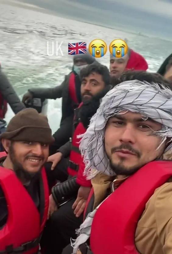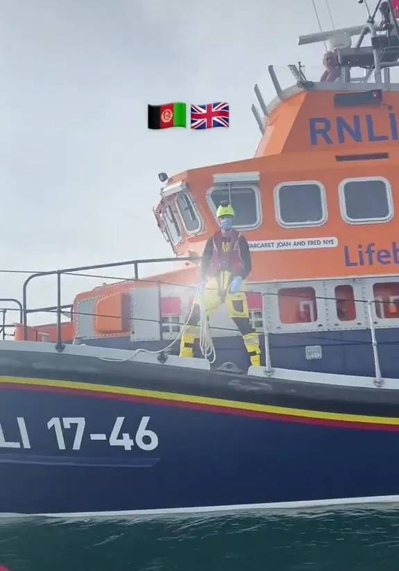 نشر المهاجر الأفغاني أسامة مقطع فيديو يظهر فيه عملية إنقاذ مركبته بواسطة قارب تابع لمؤسسة «إنقاذ الحياة» الملكية الوطنية (مواقع التواصل الاجتماعي)