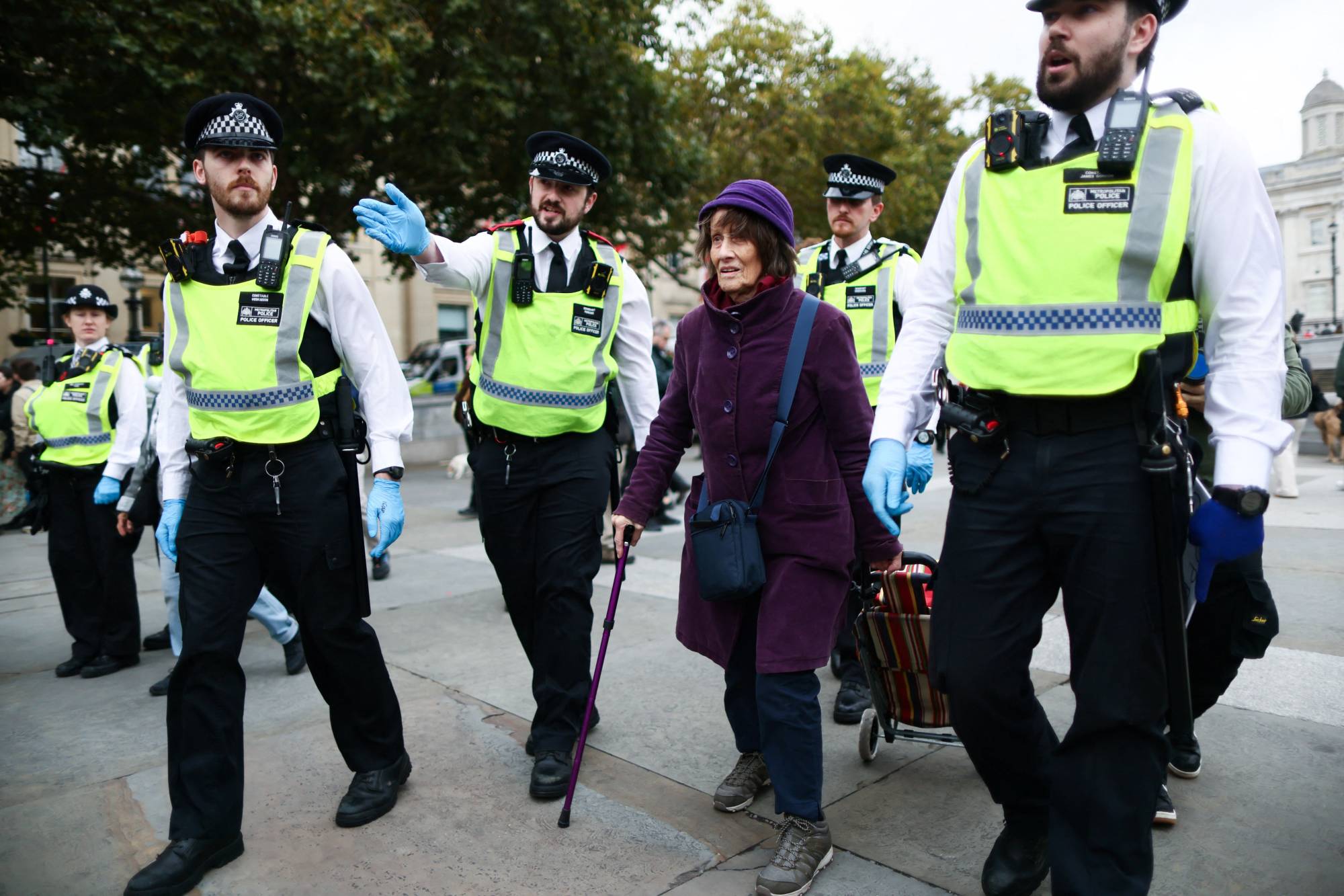 الشرطة البريطانية تصطحب سيدة بعيداً عن مظاهرة في لندن دعماً لحركة «فلسطين أكشن» (رويترز)