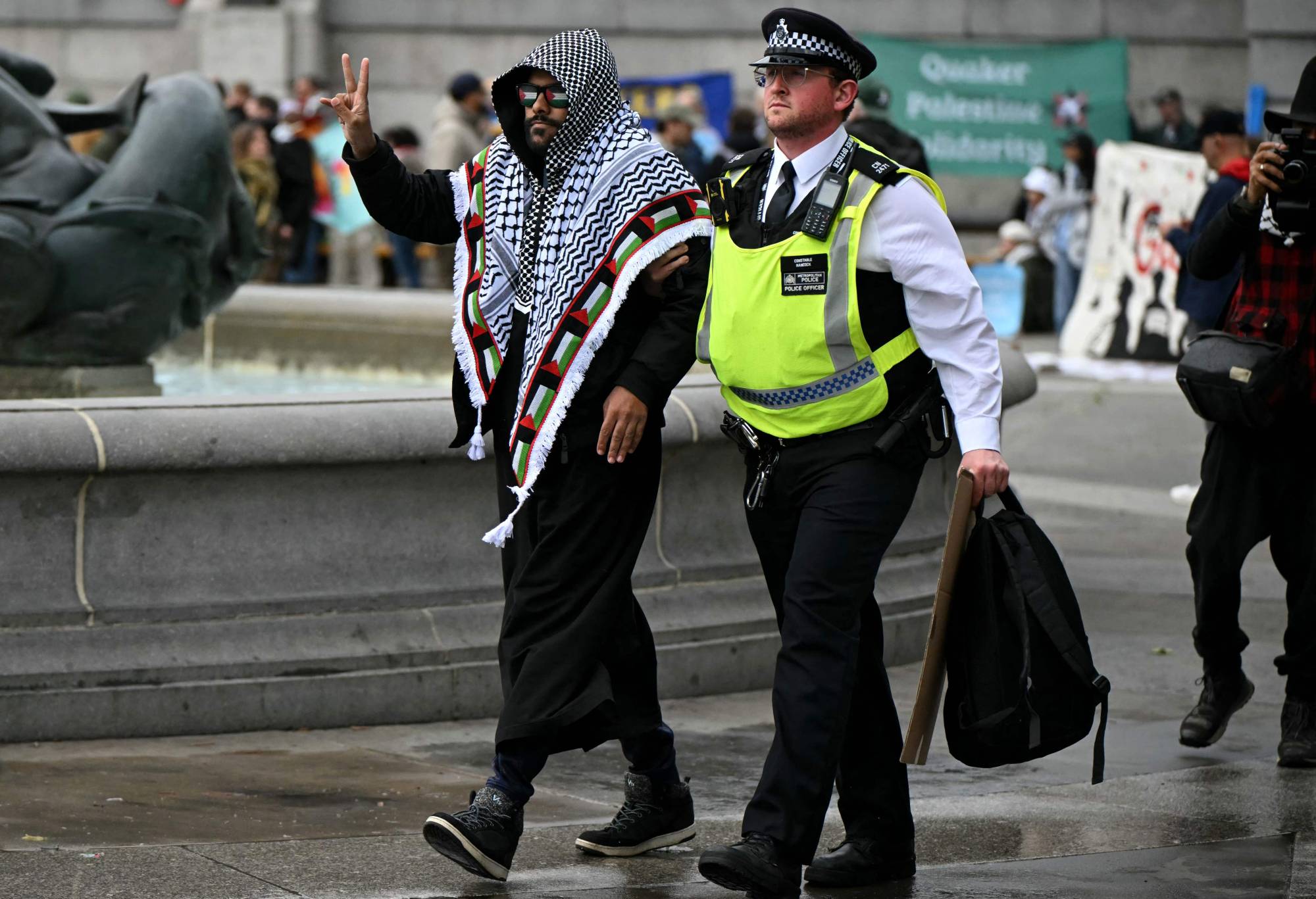 الشرطة البريطانية تعتقل رجلاً يرفع علامة النصر ويرتدي كوفية فلسطينية مزينة بعلم فلسطين خلال مظاهرة في لندن دعماً لحركة «فلسطين أكشن» (أ.ف.ب)