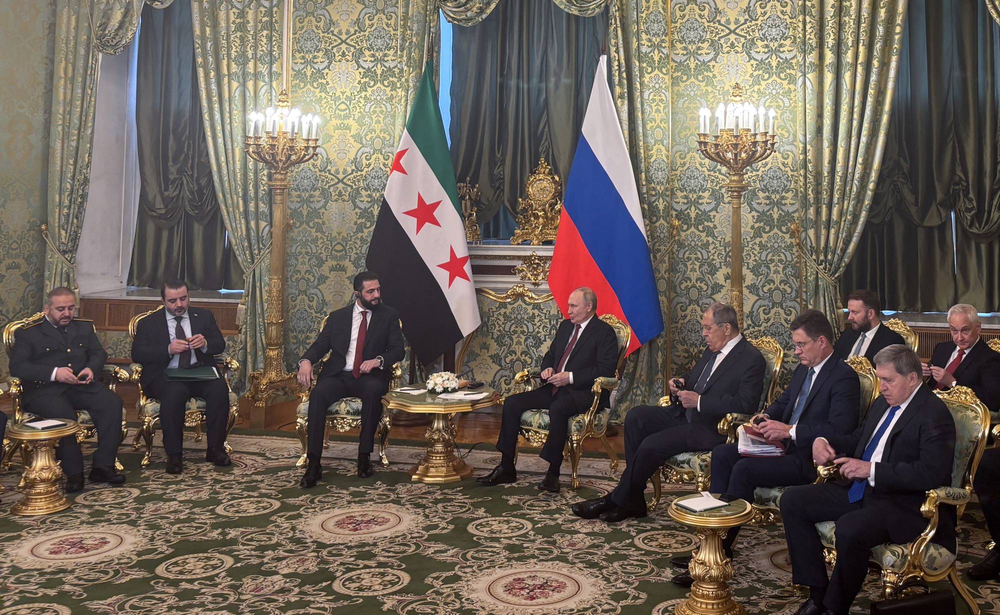 وإضافة إلى الرئيس بوتين، حضر جلسة المحادثات مع الشرع في الكرملين اليوم وزير الدفاع الروسي أندريه بيلاوسوف، ووزير الخارجية سيرغي لافروف، ونائب رئيس إدارة الرئاسة مكسيم أوريشكين، ومساعد الرئيس الروسي يوري أوشاكوف، ونائب رئيس الوزراء ألكسندر نوفاك. ومن الجانب السوري حضر وزيرا الخارجية والدفاع أسعد الشيباني ومرهف أبو قصرة.