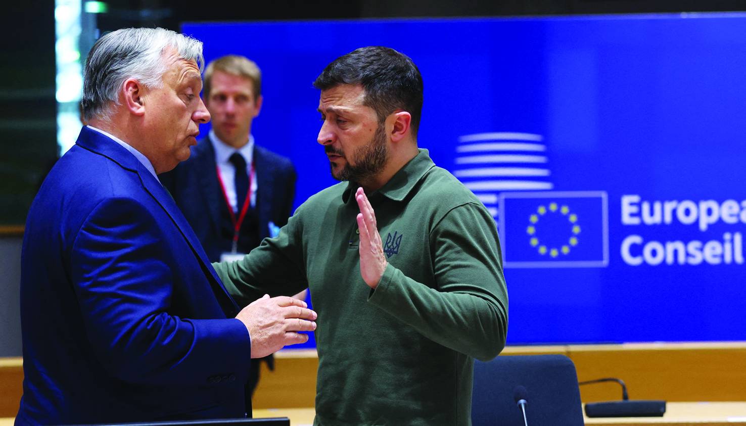 أوربان يتحدث إلى زيلينسكي خلال قمة زعماء الاتحاد الأوروبي في بروكسل 27 يونيو 2024 (رويترز)