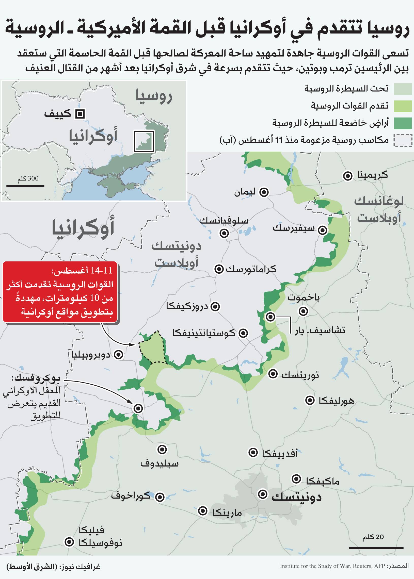 وكان الرئيس فلاديمير بوتين تحدث قبل أيام عن اقتراب بلاده من حسم المعركة على هذه الجبهة، وفي حال إحكام سيطرة القوات الروسية على بوكروفسك سيفتح أمامها هذا التقدم طريقاً لاستكمال بسط سيطرة مطلقة على ما تبقى من بلدات وقرى مقاطعة دونيتسك، ووصف خبراء عسكريون المدينة بأنها «بوابة دونتيسك الحقيقية»، وهي المنطقة التي أعلنت روسيا ضمّها إلى أراضيها، وتسيطر حالياً على نحو 73 في المائة منها فقط.