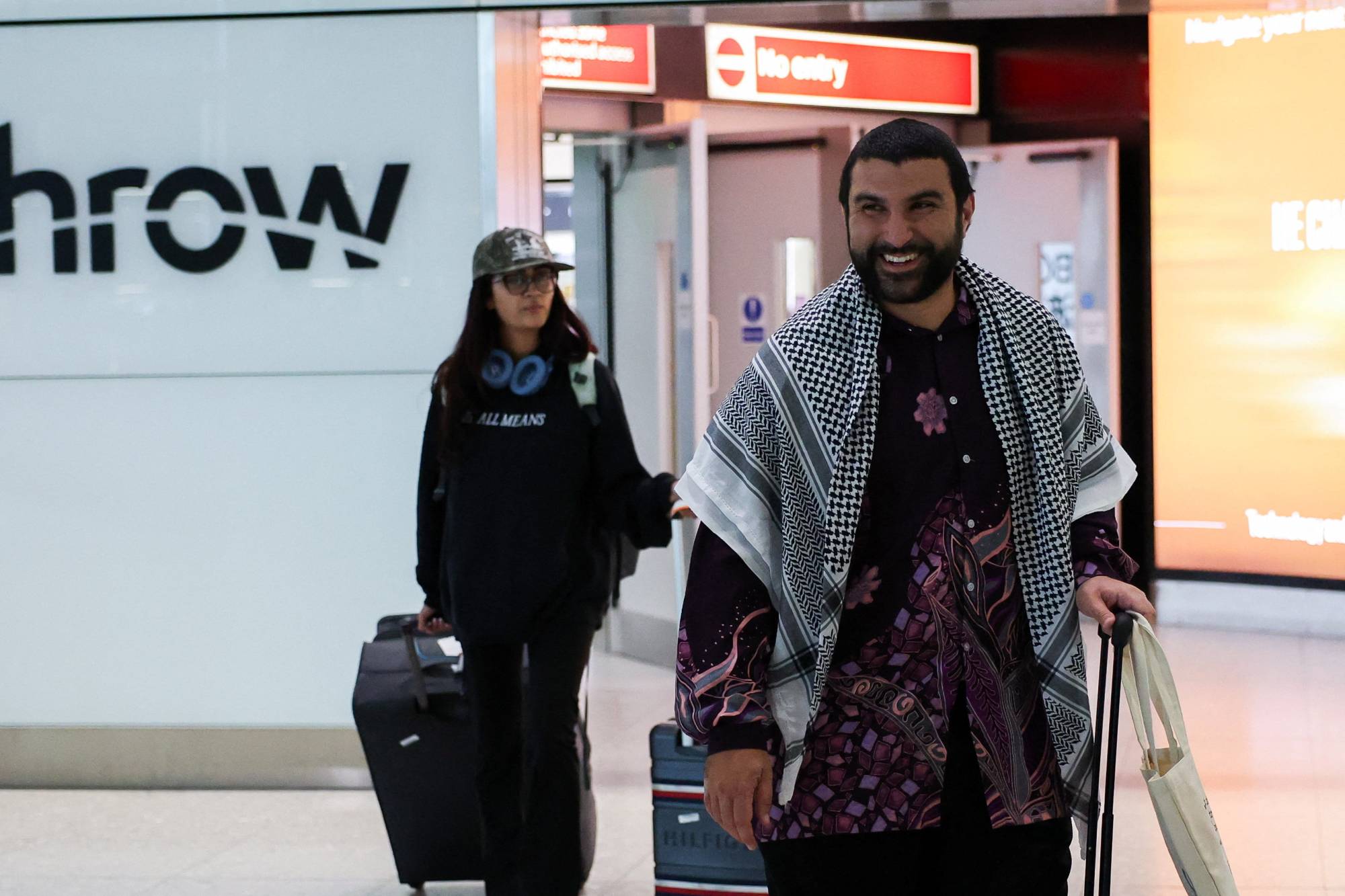 المعلق السياسي البريطاني المؤيد للفلسطينيين سامي حمدي في مطار هيثرو بلندن بعد عودته من الاحتجاز بالولايات المتحدة (رويترز)