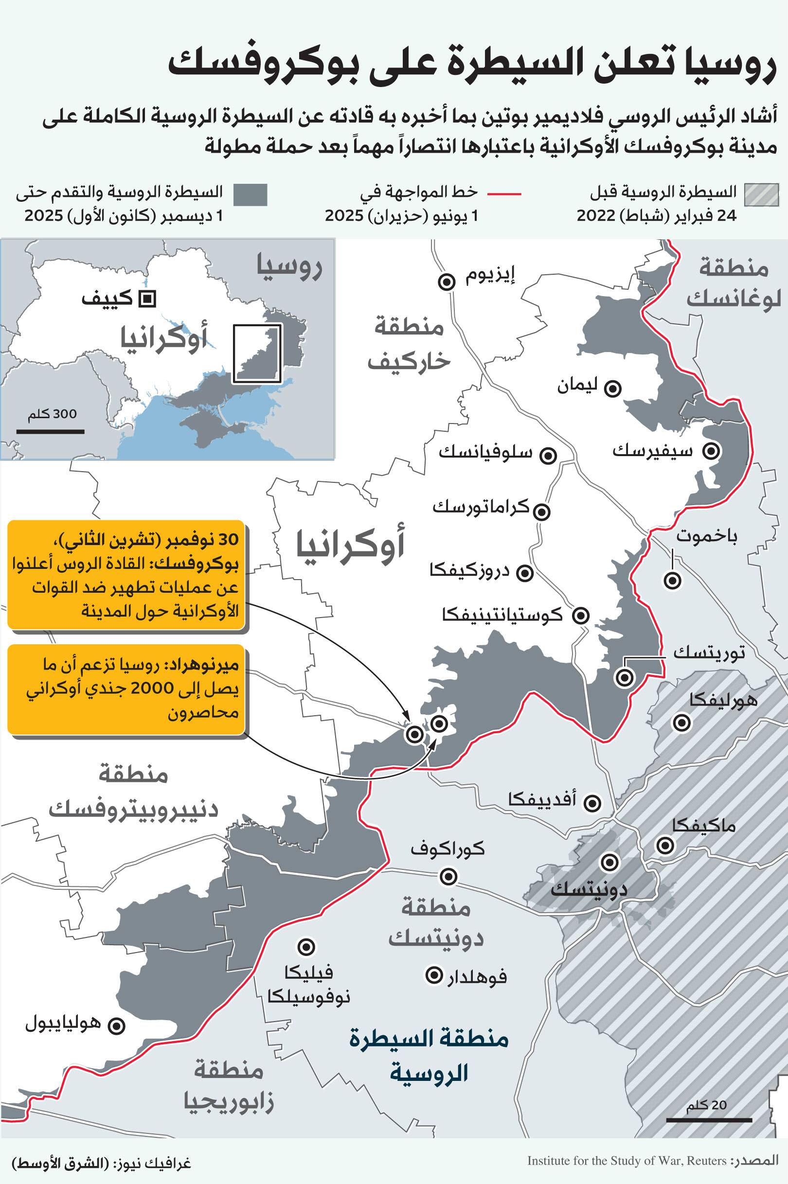 وحالياً، بات الجيش الروسي يسيطر على 99.7 في المائة من لوغانسك، و79 في المائة من دونيتسك، و74 في المائة من منطقة زابوريجيا، و76 في المائة من منطقة خيرسون. وهذه هي الأقاليم الأربعة التي ضمتها روسيا بشكل أحادي وتتفاوض أوكرانيا وأوروبا لاستعادتها أو استعادة أجزاء منها على الأقل.