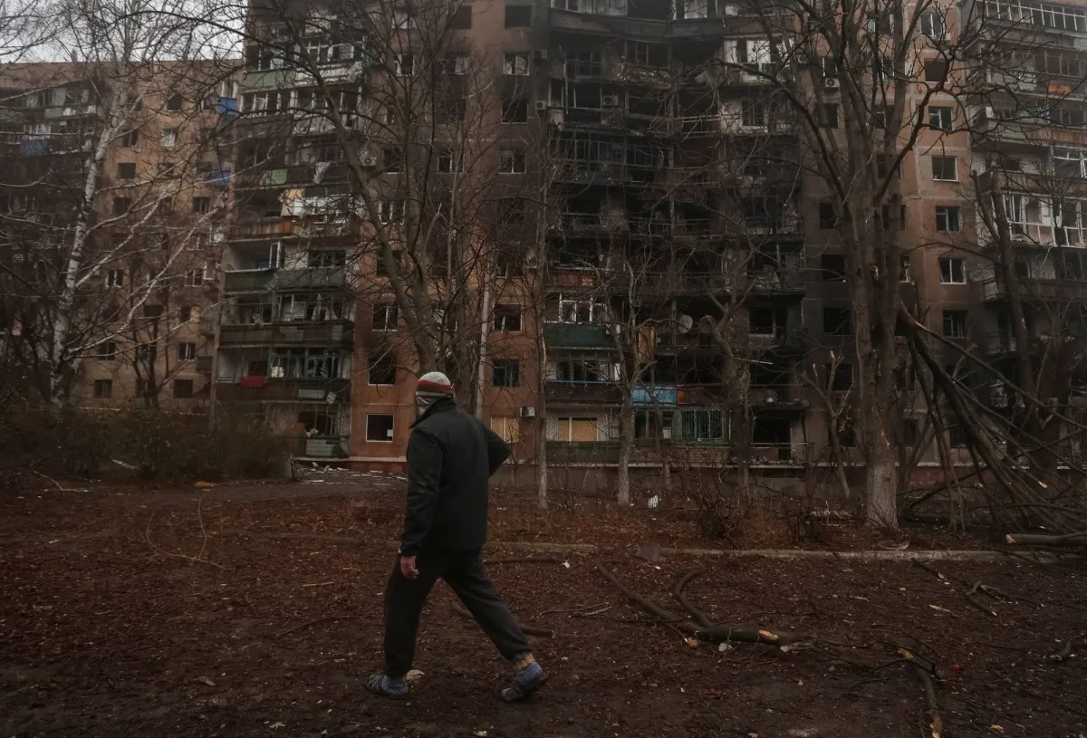 أحد السكان يسير بالقرب من مبنى سكني تضرر خلال غارة روسية على مدينة كراماتورسك في منطقة دونيتسك بأوكرانيا 2 ديسمبر 2025 (رويترز)