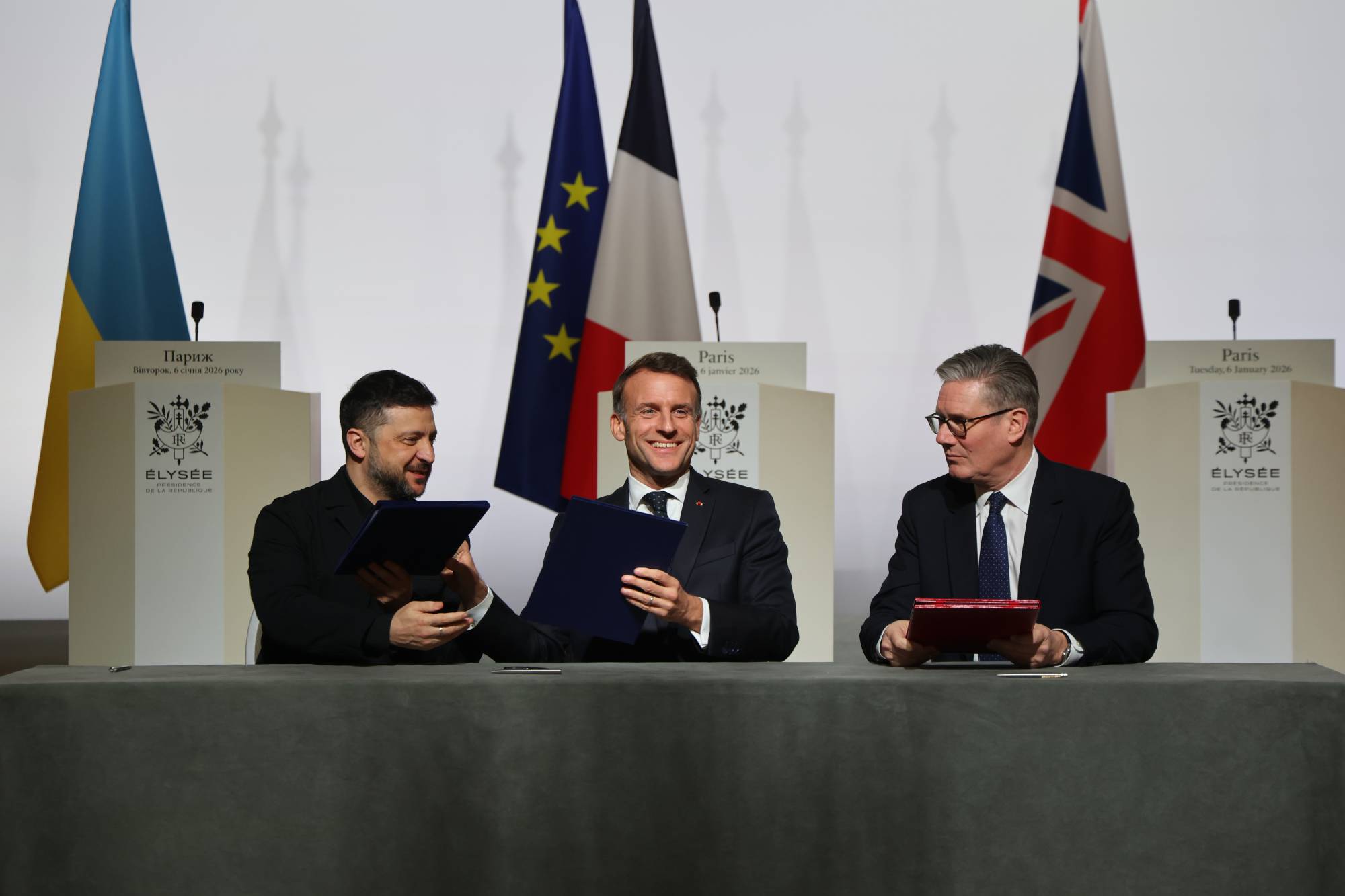 كانوا ستة وراء منصاتهم الفردية للتحدث للصحافة بعد يوم كامل من المشاورات متعددة الأطراف والأشكال في قصر الإليزيه. الرئيس الفرنسي إيمانويل ماكرون توسط المجموعة التي ضمت إليه الرئيس الأوكراني، والمستشار الألماني، ورئيس الوزراء البريطاني، وأيضاً «وخصوصاً» مستشاري الرئيس الأميركي ستيف ويتكوف وجاريد كوشنير المكلفين ملف الحرب الروسية-الأوكرانية التي ستدخل بعد خمسين يوماً عامها الخامس.