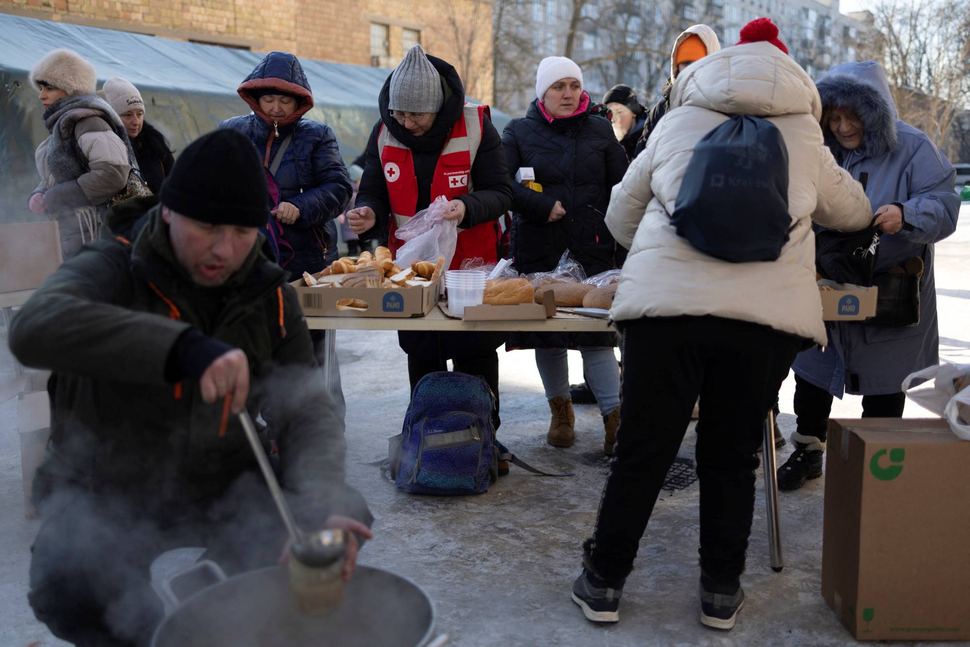 متطوعون بولنديون يوزعون الطعام في إحدى ضواحي كييف حيث أدت الهجمات الروسية إلى انقطاع الطاقة الكهربائية الثلاثاء (أ.ف.ب)