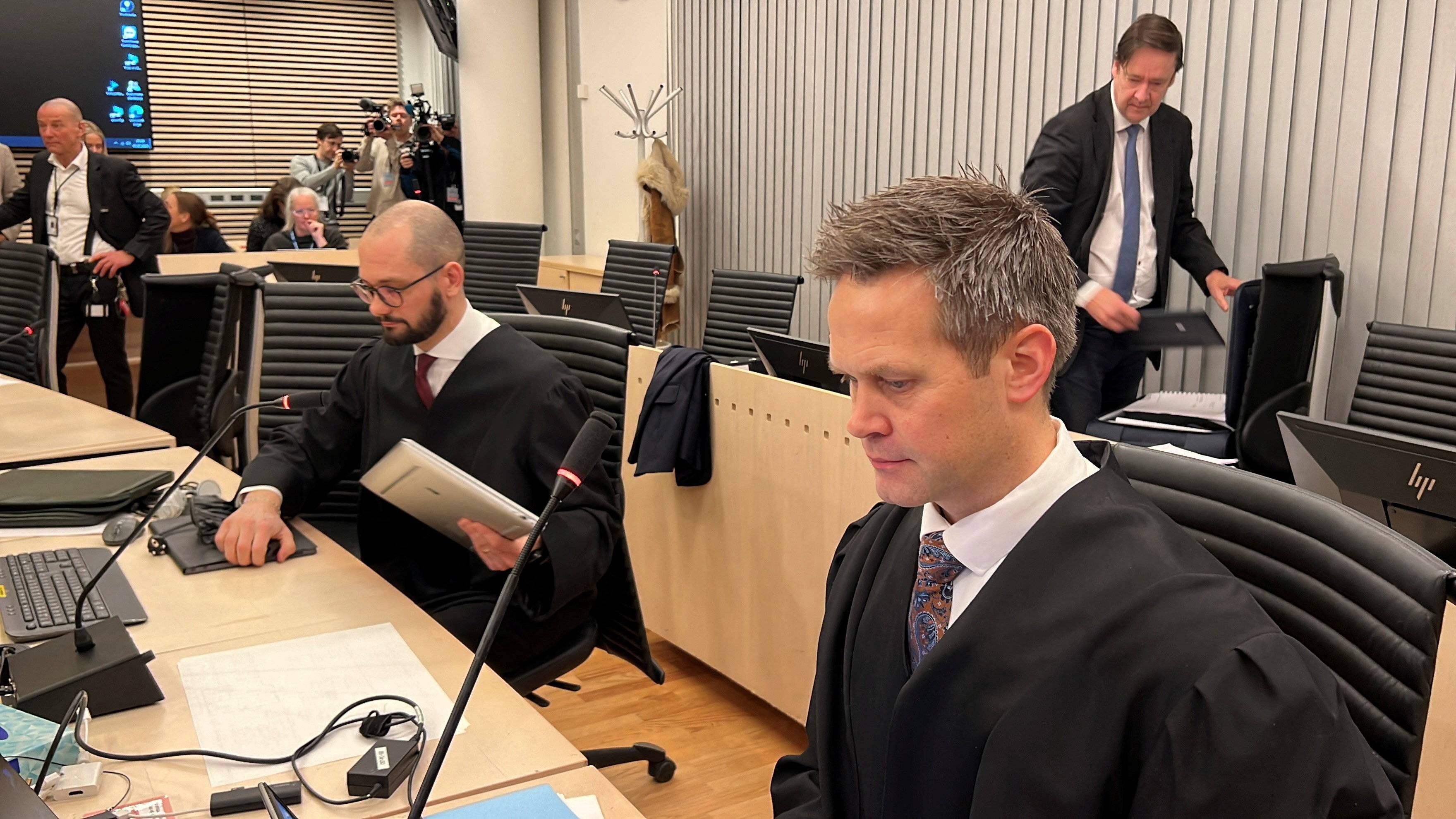 المدعي العام ستورلا هنريكسبو ومحامي الشرطة أندرياس كروسزيفسكي خلال اليوم الأول من محاكمة ماريوس بورغ هويبي في أوسلو (رويترز)