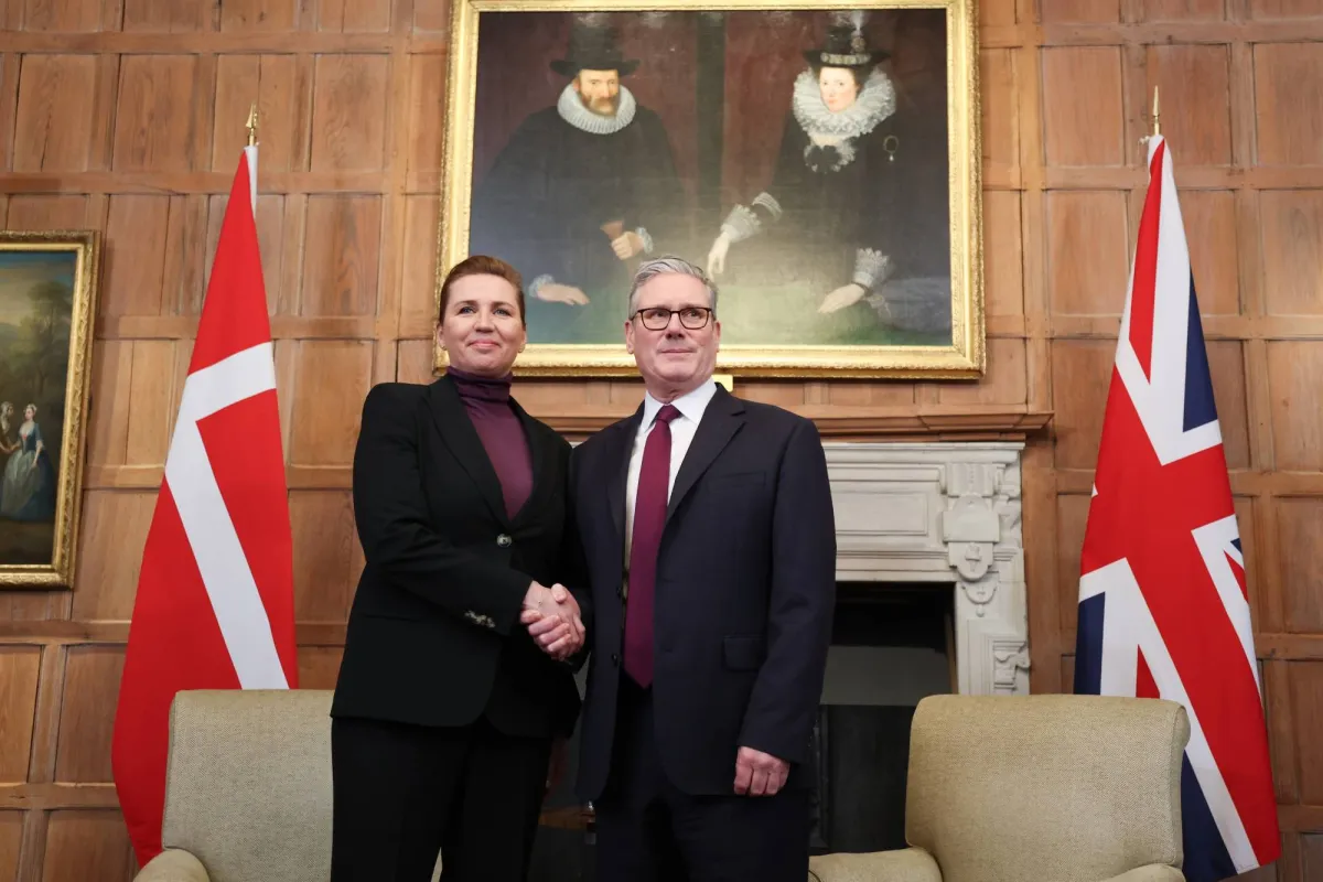 رئيس الوزراء البريطاني كير ستارمر ورئيسة الوزراء الدنماركية مته فريدريكسن يتصافحان خلال اجتماع ثنائي في تشيكرز المقر الريفي الرسمي لرئيس وزراء المملكة المتحدة في باكينغهامشير 22 يناير 2026 (إ.ب.أ)