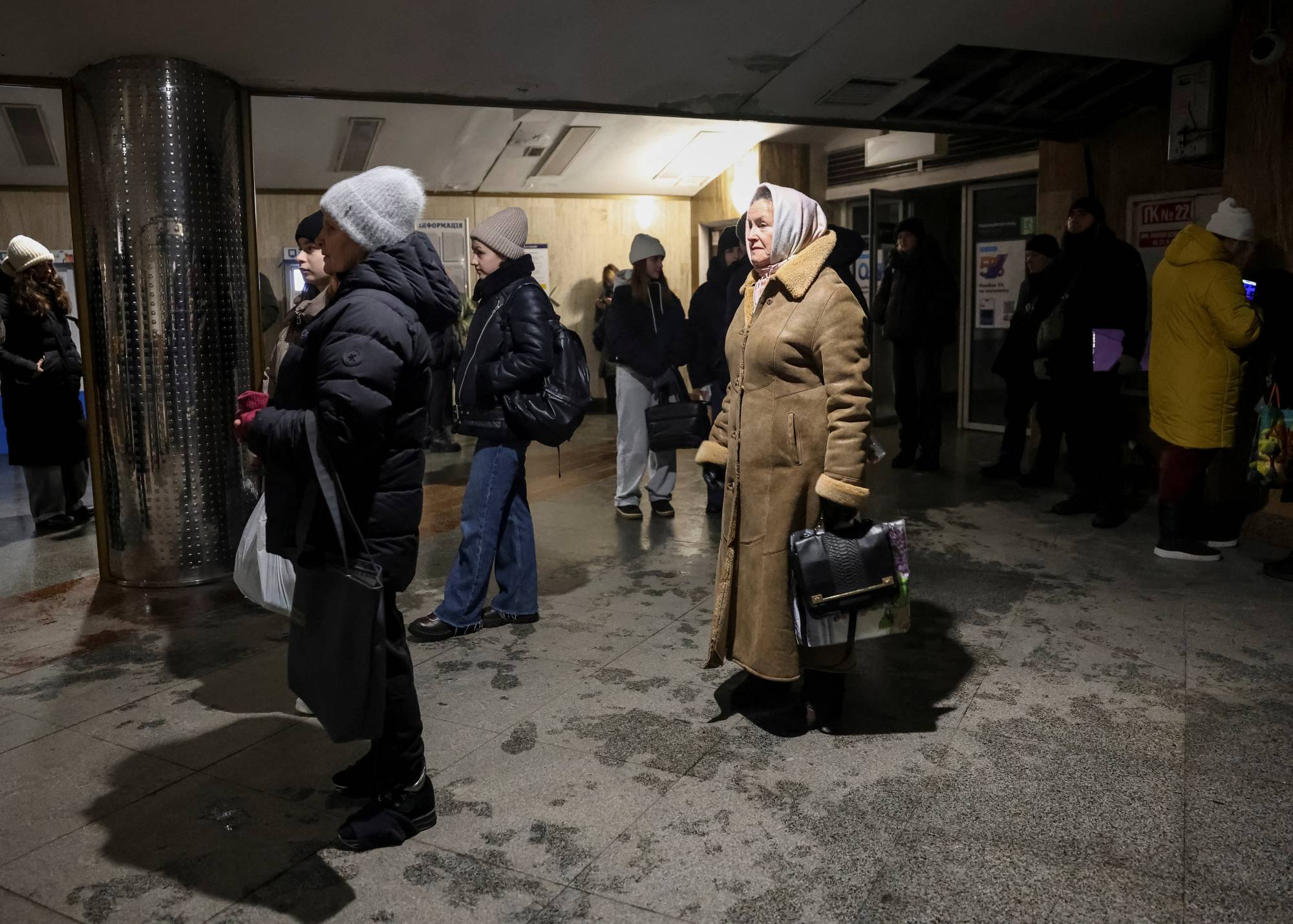 أوكرانيون عند مدخل محطة لقطارات الأنفاق في كييف بعد توقفها عن العمل (رويترز)