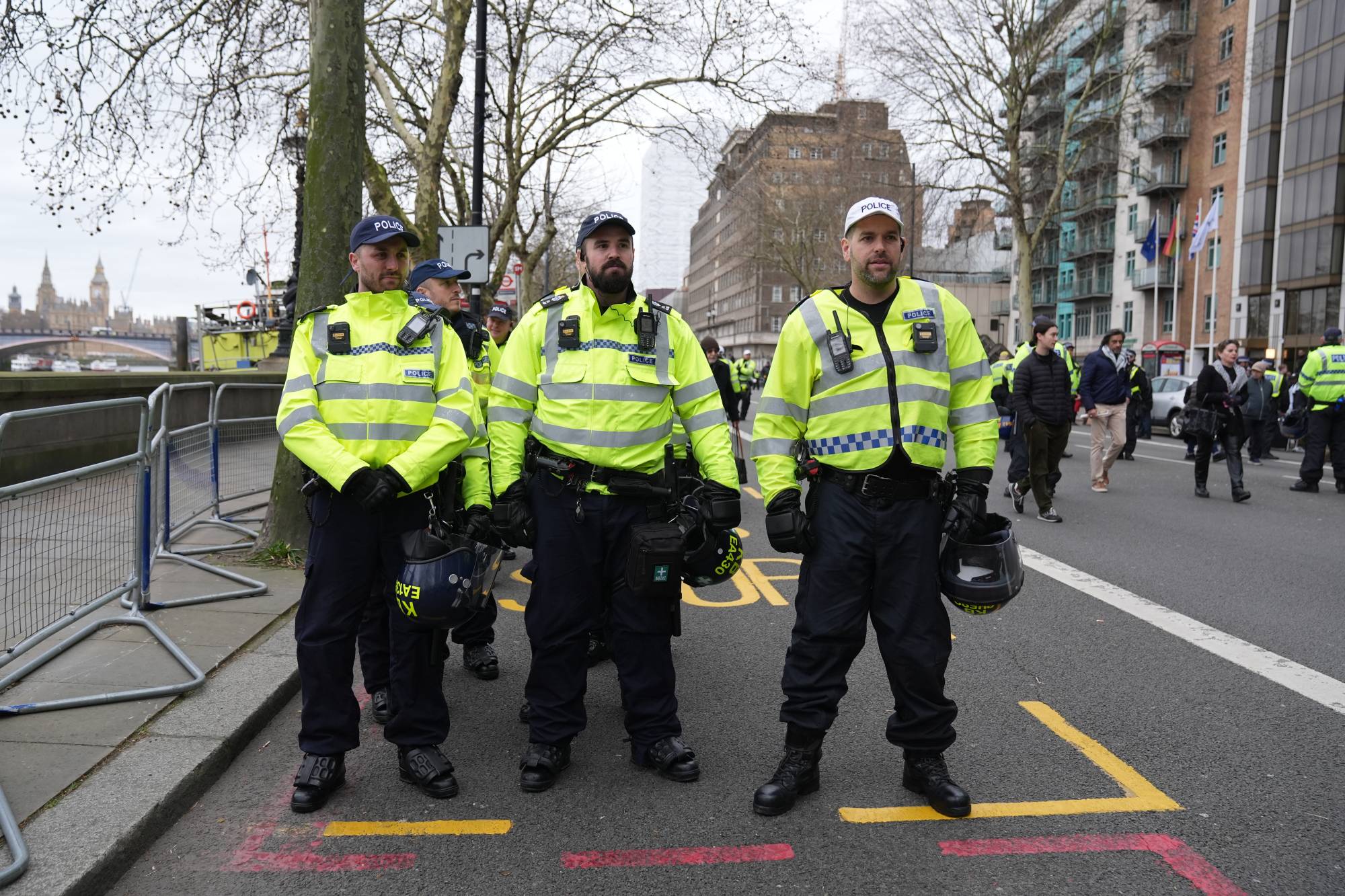 أفراد من الشرطة يقفون حراساً خلال مسيرة وسط العاصمة البريطانية لندن يوم 15 مارس 2026 (د.ب.أ)