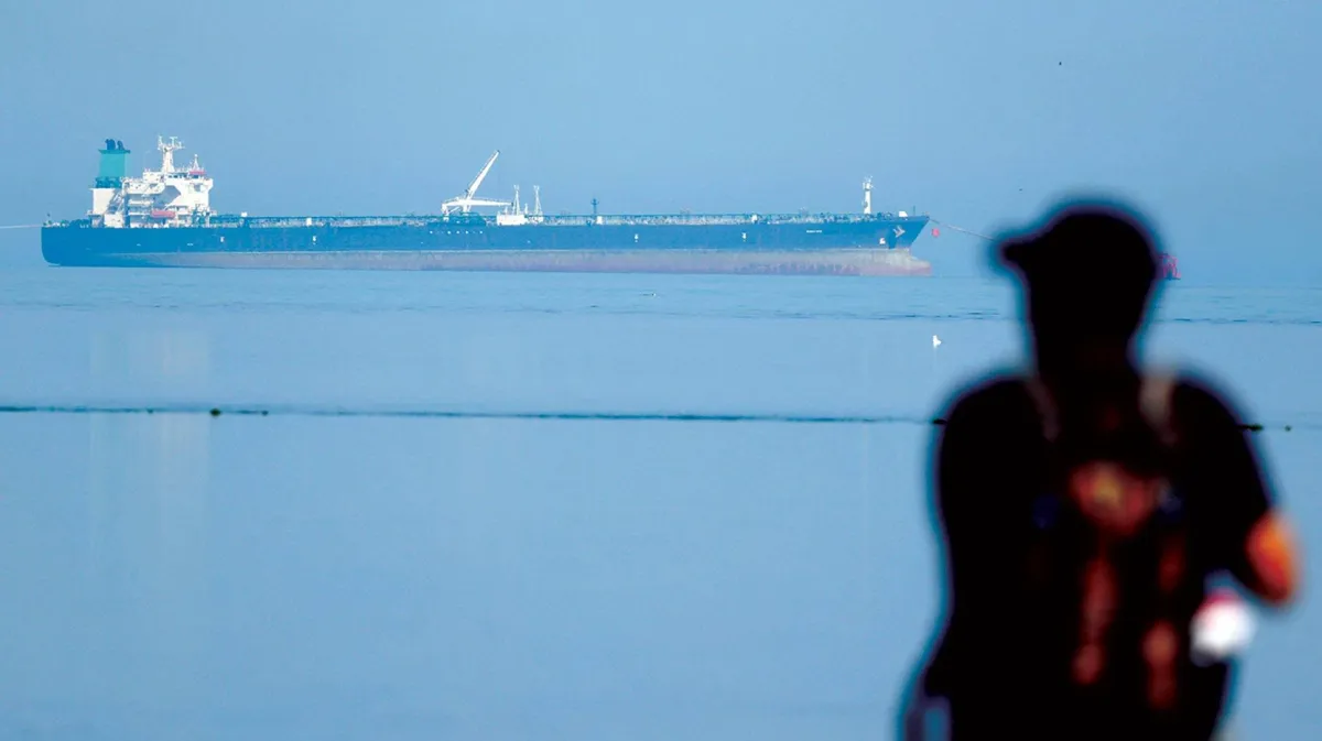 رجل يتابع ناقلة نفط روسية لدى مرورها قرب شاطئ ولاية غوجارات بالهند (رويترز)