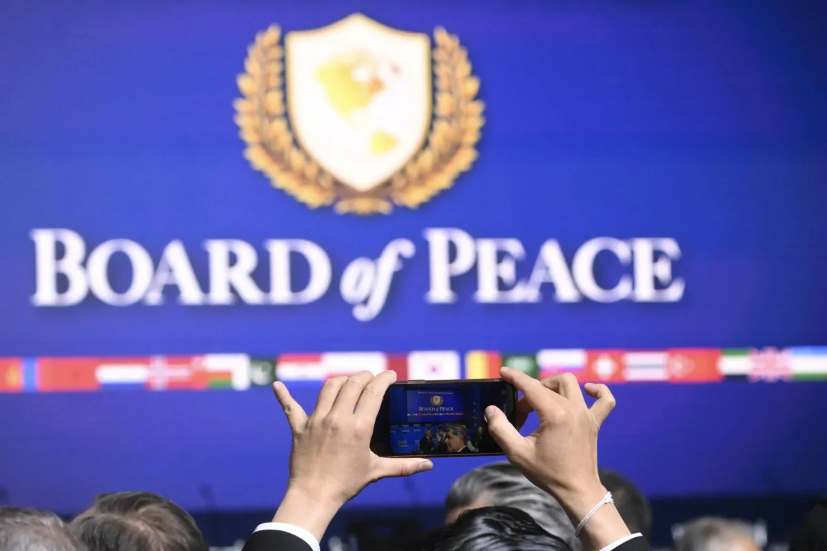 مشارك في اجتماع «مجلس السلام» لغزة يلتقط صورة للشعار خلال أول اجتماعاته بواشنطن في 19 فبراير 2026 (إ.ب.أ)