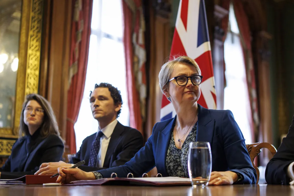 وزيرة الخارجية البريطانية إيفيت كوبر (يمين) تُلقي كلمتها الافتتاحية خلال استضافتها اجتماعاً افتراضياً مع وزراء خارجية الدول الموقِّعة على الاتفاقية بشأن تأمين مضيق هرمز 2 أبريل 2026 (إ.ب.أ)