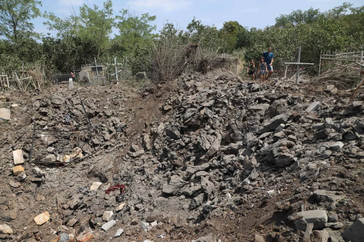 حفرة في مقبرة أوديسا التي أصيبت خلال هجوم صاروخي اليوم (أ.ف.ب)