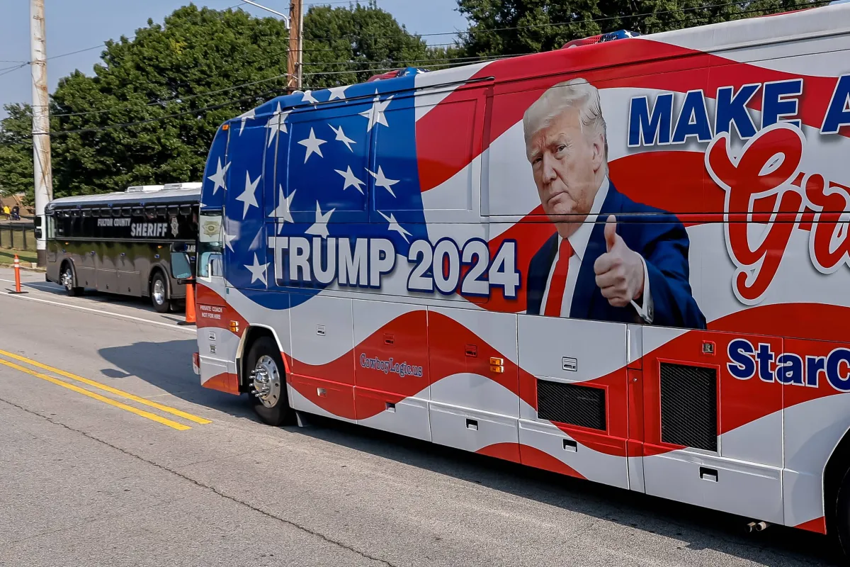 حافلة عليها صورة ترمب قرب سجن مقاطعة فولتون أمس (إ. ب. أ)