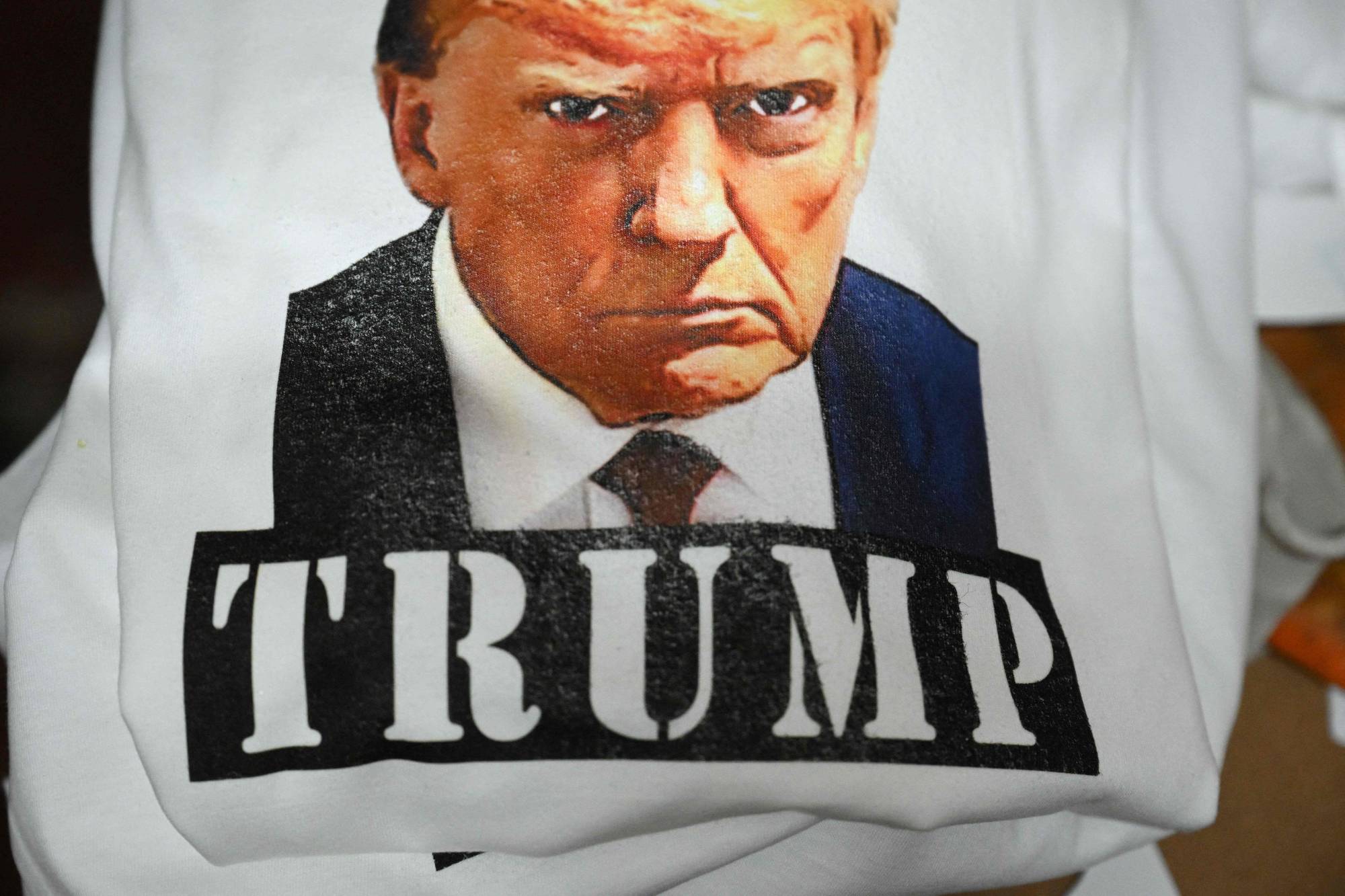 صورة المشتبه به التي التقطت لترمب في سجن فولتون مطبوعة على قميص للبيع بكالفورنيا الاربعاء (أ. ف. ب)