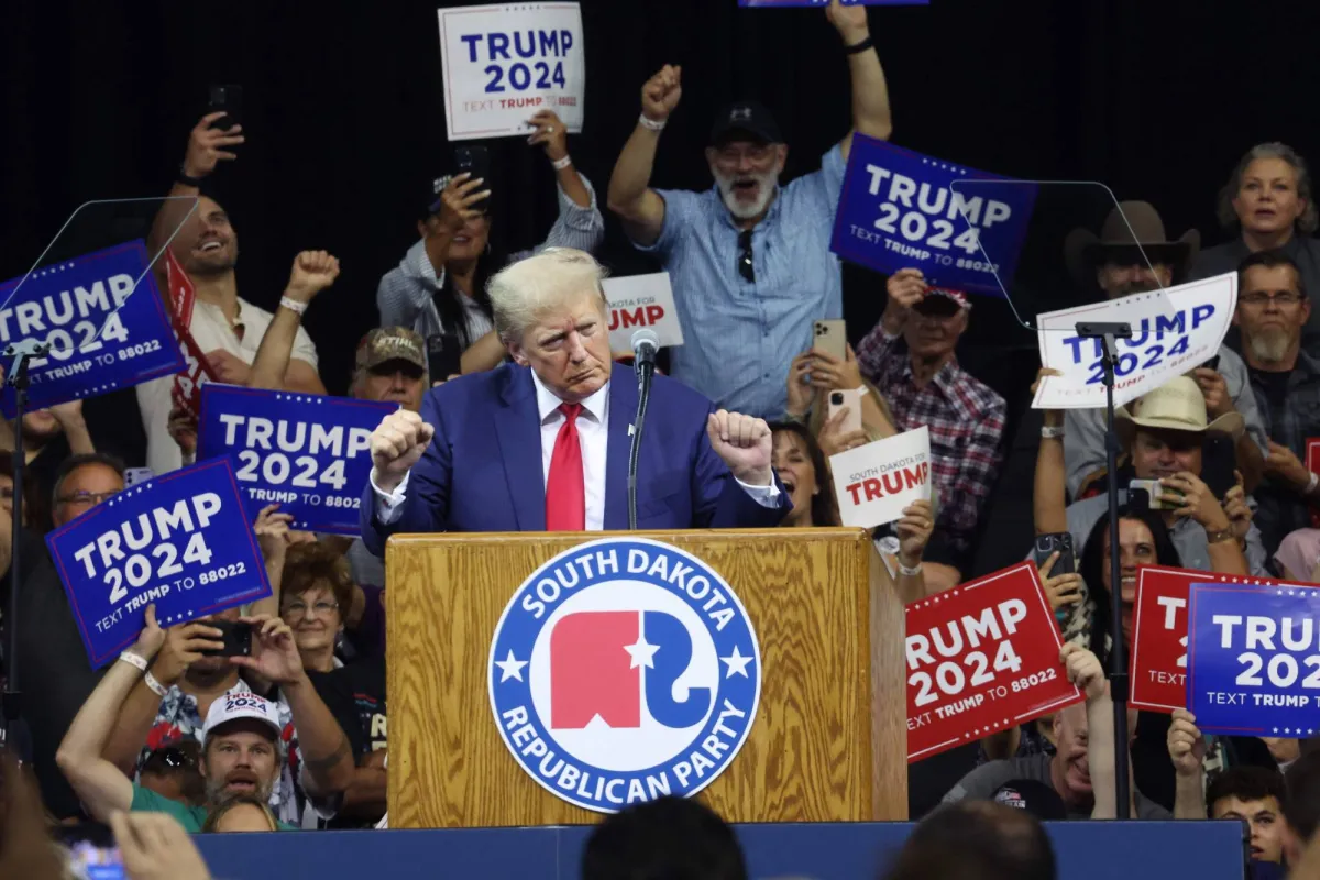 الرئيس الأميركي السابق دونالد ترمب يلقي كلمة في داكوتا الجنوبية الجمعة (أ.ف.ب)