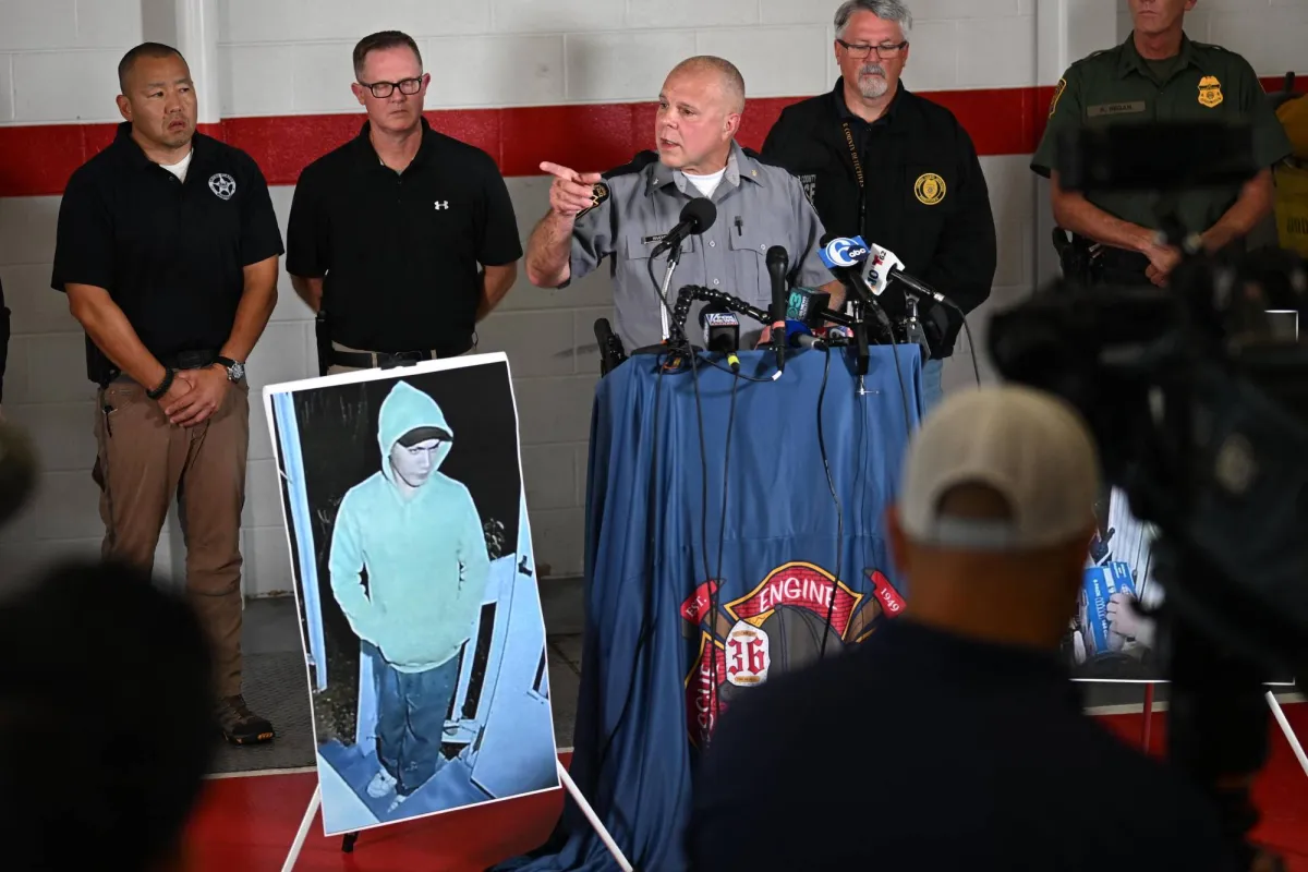 اللفتنانت كولونيل جورج بيفنز من شرطة ولاية بنسلفانيا خلال مؤتمر صحافي عرضت خلاله صورة المجرم الفار (أ.ف.ب)