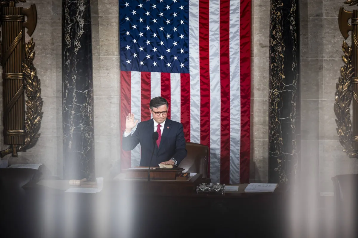 رئيس مجلس النواب الأميركي مايك جونسون خلال تأديته القسم الدستوري (إ.ب.أ)