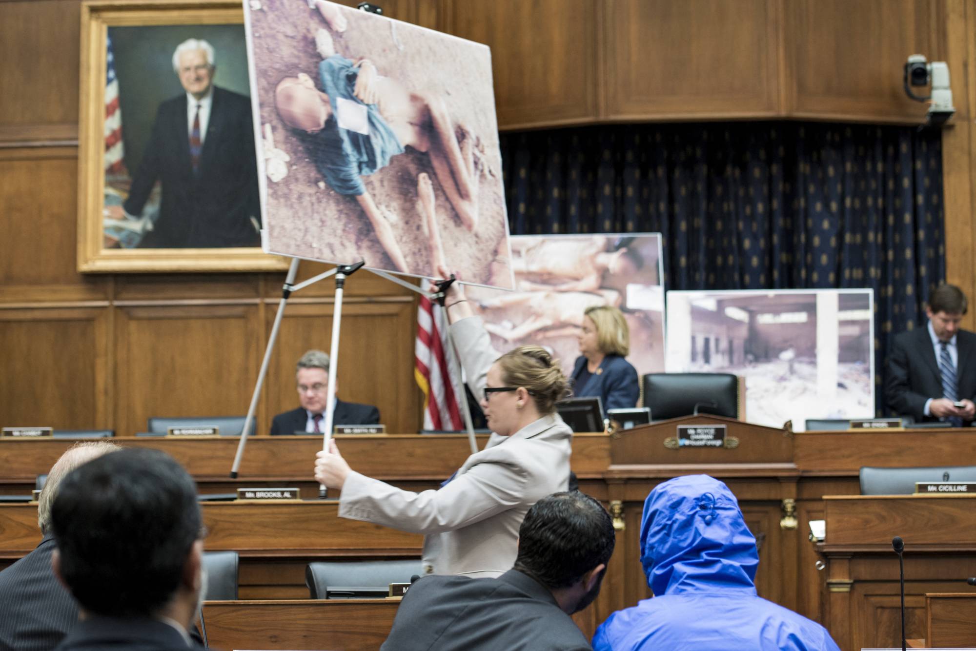 صورة أرشيفية لـ«قيصر» مخفياً هويته بمعطف أزرق خلال جلسة نقاش في الكونغرس الأميركي لقانون حماية المدنيين السوريين (أ.ف.ب)