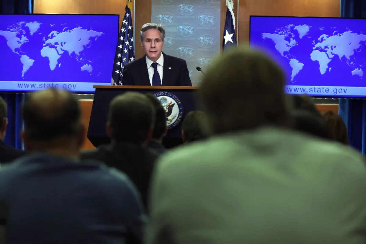 وزير الخارجية الأميركي أنتوني بلينكن يتحدث خلال مؤتمر صحافي في وزارة الخارجية (أ.ف.ب)
