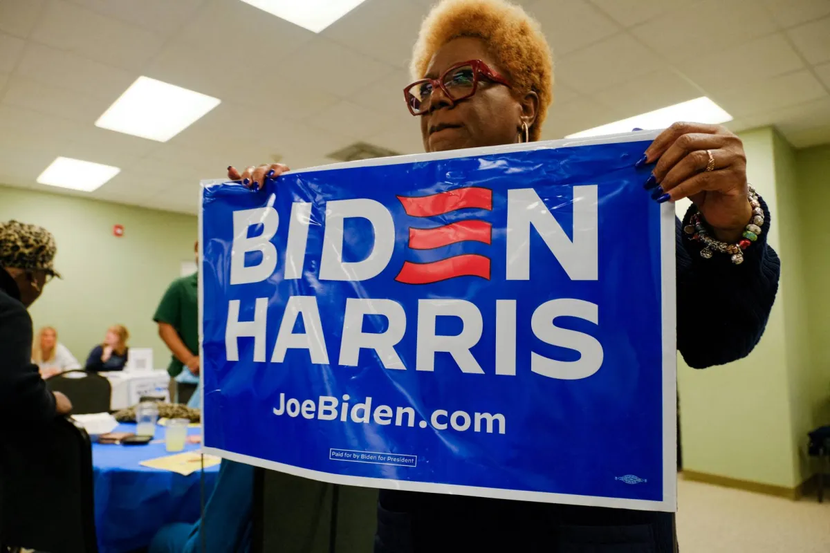 رئيسة مجلس الديمقراطيين السود في ساوث كارولاينا مارغريت سومبتر تحمل لافتة انتخابية بمناسبة إطلاق جهود التصويت للانتخابات التمهيدية في هوبكنز بساوث كارولاينا الأحد (رويترز)