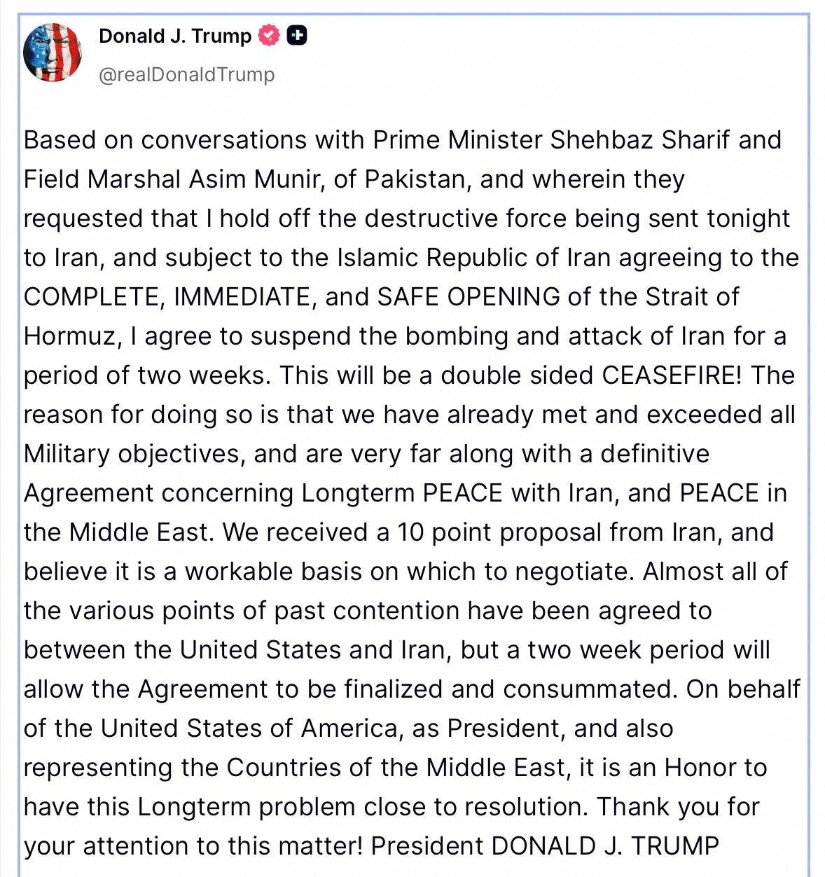 منشور لترمب يعلن فيه عن اتفاق وقف إطلاق نار مع إيران لأسبوعين 7 أبريل 2026 (رويترز)