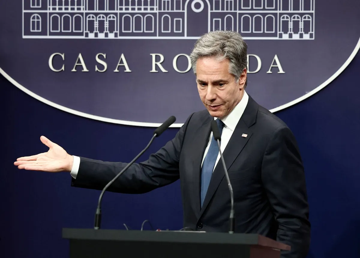 وزير الخارجية الأميركي أنتوني بلينكن يحضر مؤتمراً صحافياً مشتركاً مع وزيرة الخارجية الأرجنتينية ديانا موندينو في قصر كازا روسادا الرئاسي في بوينس آيرس بالأرجنتين (رويترز)