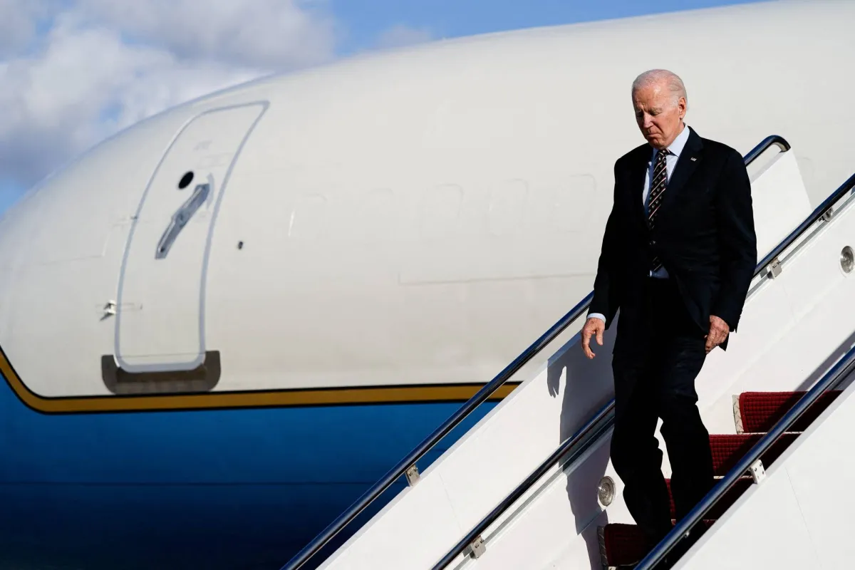 الرئيس الأميركي جو بايدن أثناء ترجله من الطائرة (رويترز)