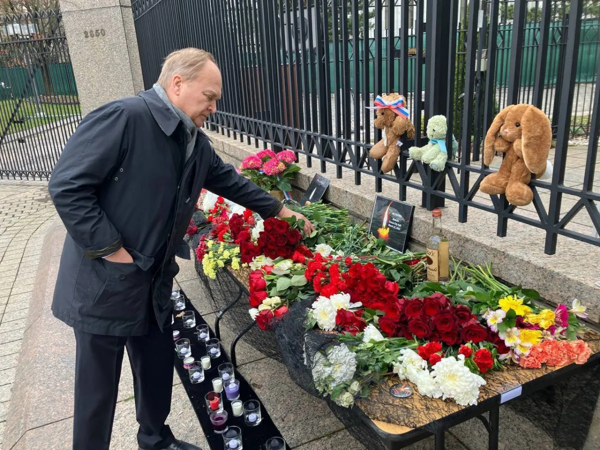 سفير روسيا لدى الولايات المتحدة أناتولي أنتونوف يضع زهوراً خارج مبنى السفارة تكريماً لضحايا الهجوم على قاعة للحفلات الموسيقية (حساب السفارة على تلغرام)