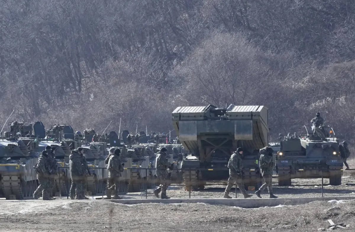 جنود كوريون جنوبيون يسيرون إلى جانب مركباتهم المدرعة خلال مناورة عسكرية بالقرب من الحدود مع كوريا الشمالية (أ.ب)