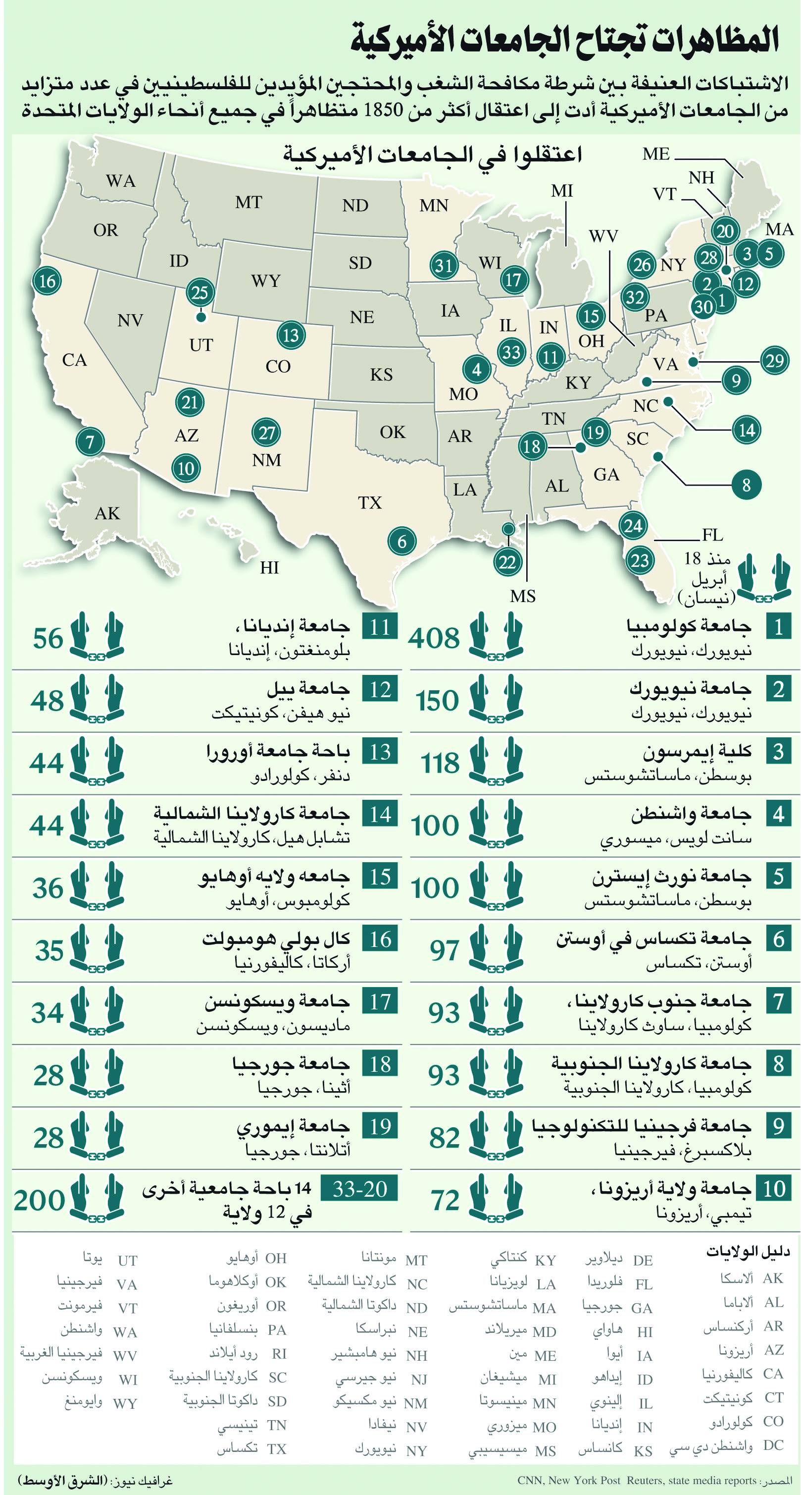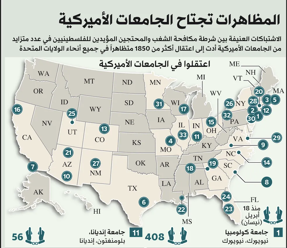 إنفوغراف... المظاهرات تجتاح الجامعات الأميركية