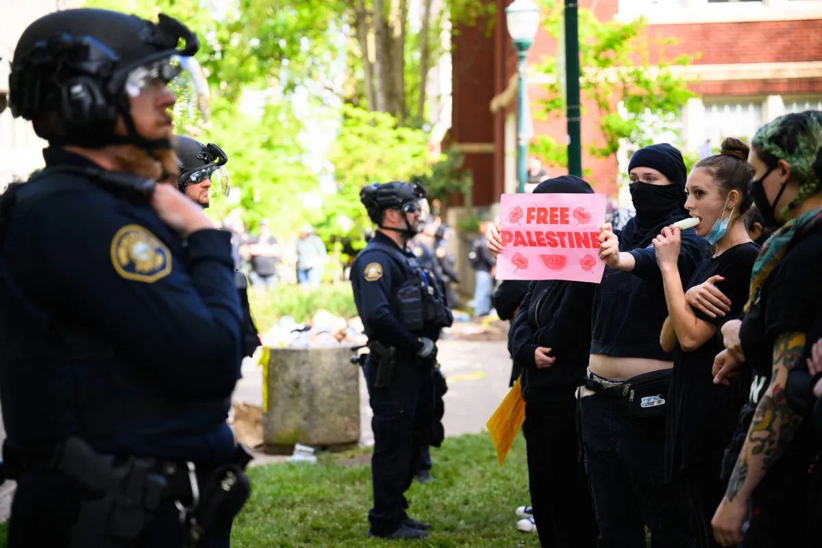 متظاهرون مؤيدون للفلسطينيين يواجهون الشرطة في حرم جامعة ولاية بورتلاند (أ.ف.ب)