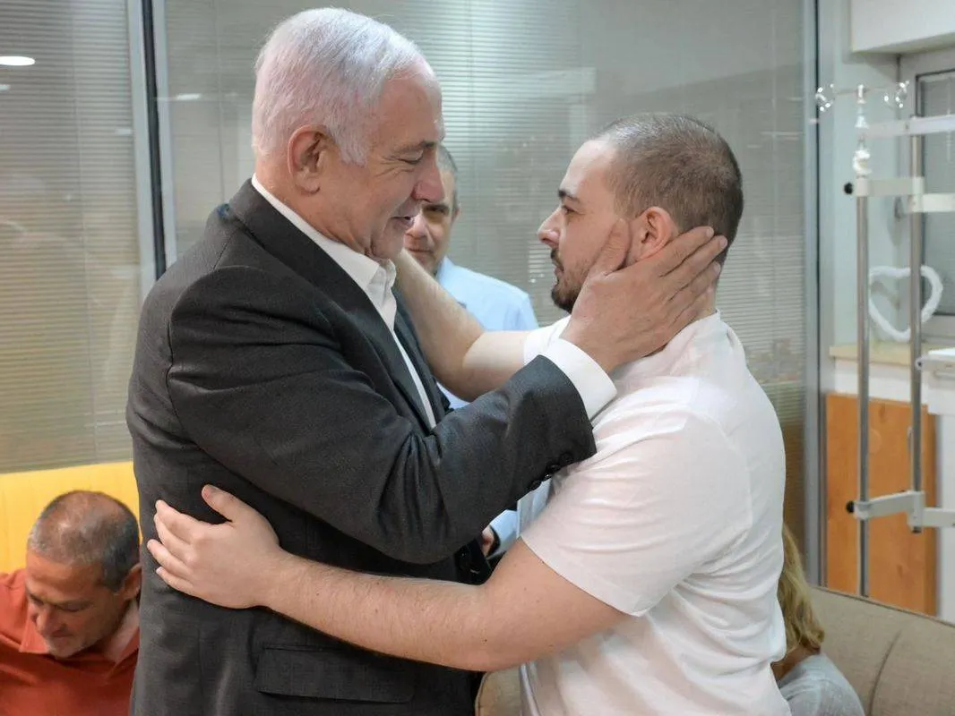 رئيس الوزراء الإسرائيلي بنيامين نتنياهو يحتضن أحد الرهائن بعد تحرير محتجزين إسرائيليين بالقطاع (د.ب.أ)