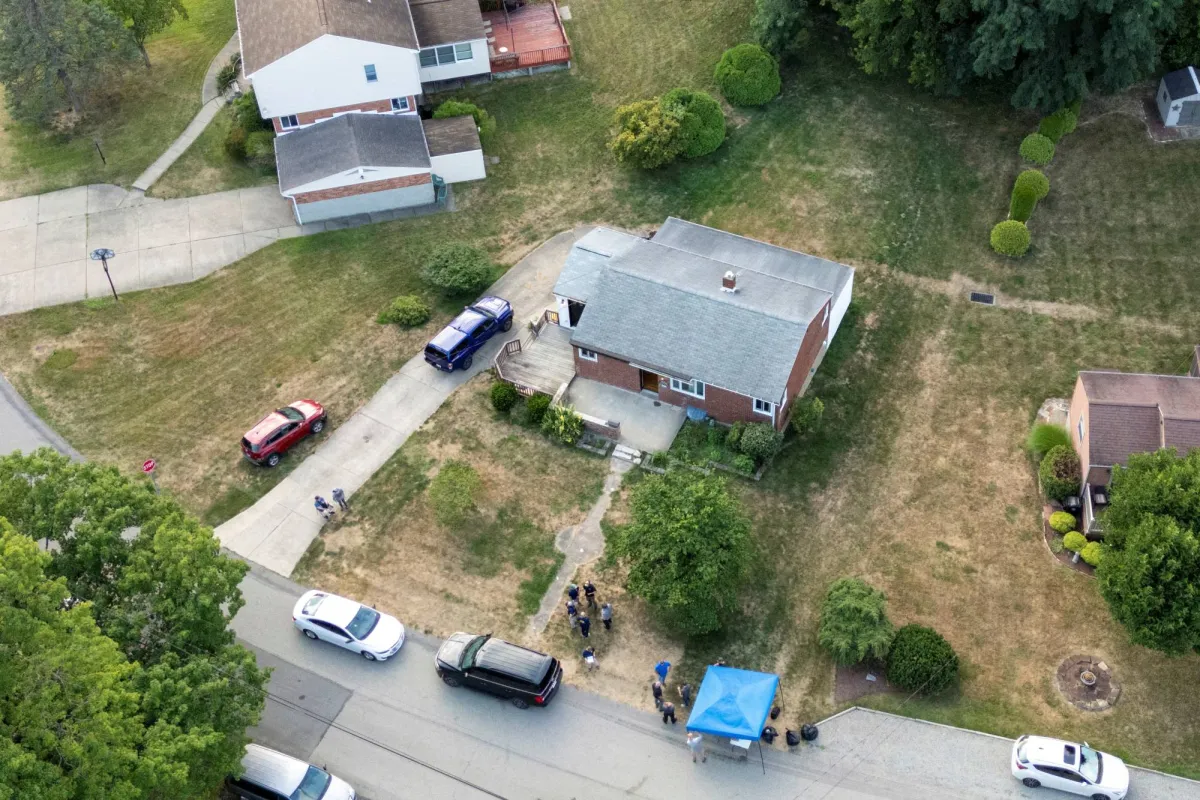 منظر من أعلى يظهر مركبات أفراد إنفاذ القانون الذين يعملون في منزل توماس ماثيو كروكس البالغ من العمر 20 عاماً الأسبوع الماضي (رويترز)