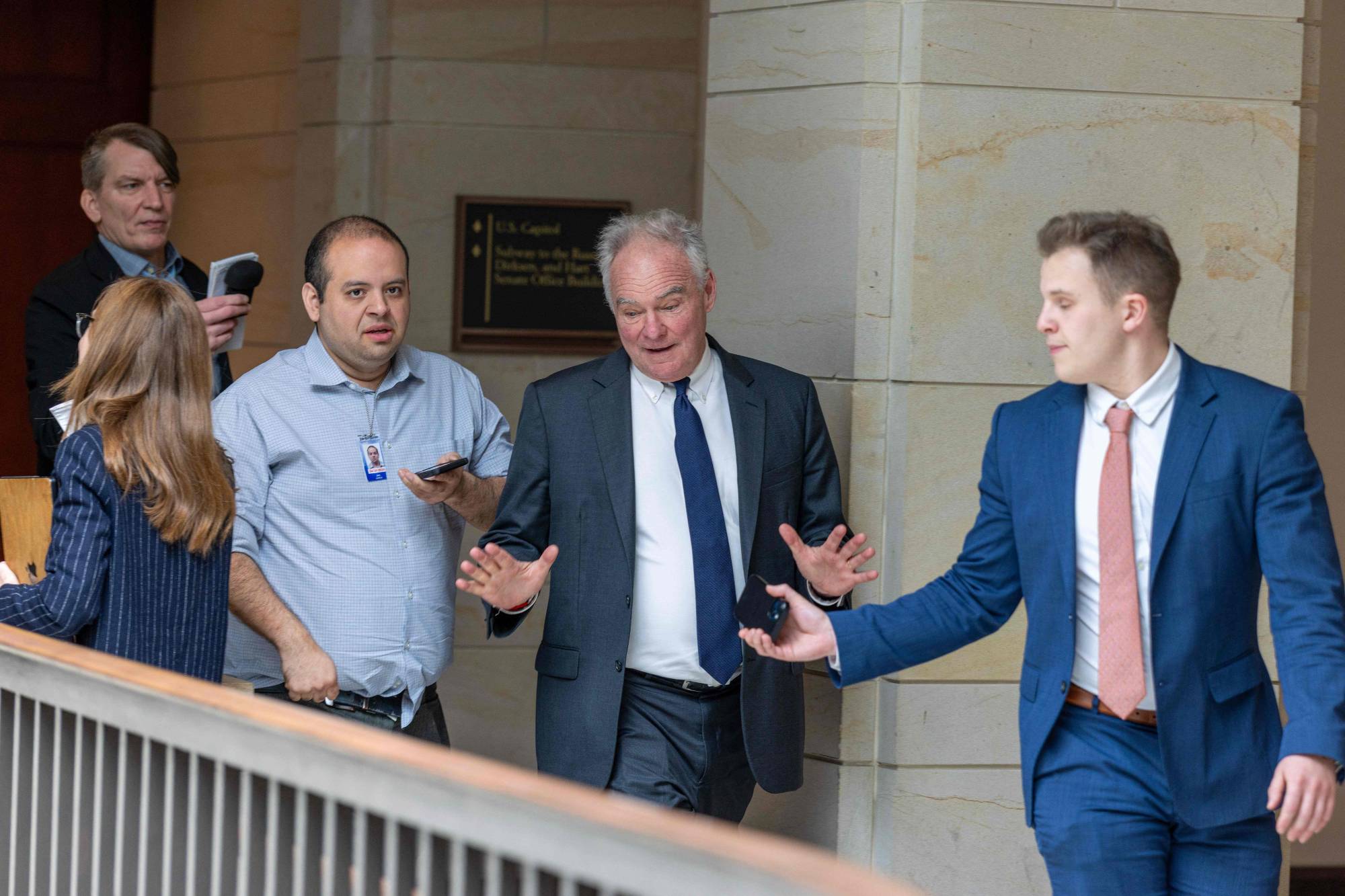 السيناتور الديمقراطي تيم كاين يتوجه إلى إحاطة مغلقة حول حرب إيران في الكونغرس يوم 25 مارس 2026 (أ.ف.ب)