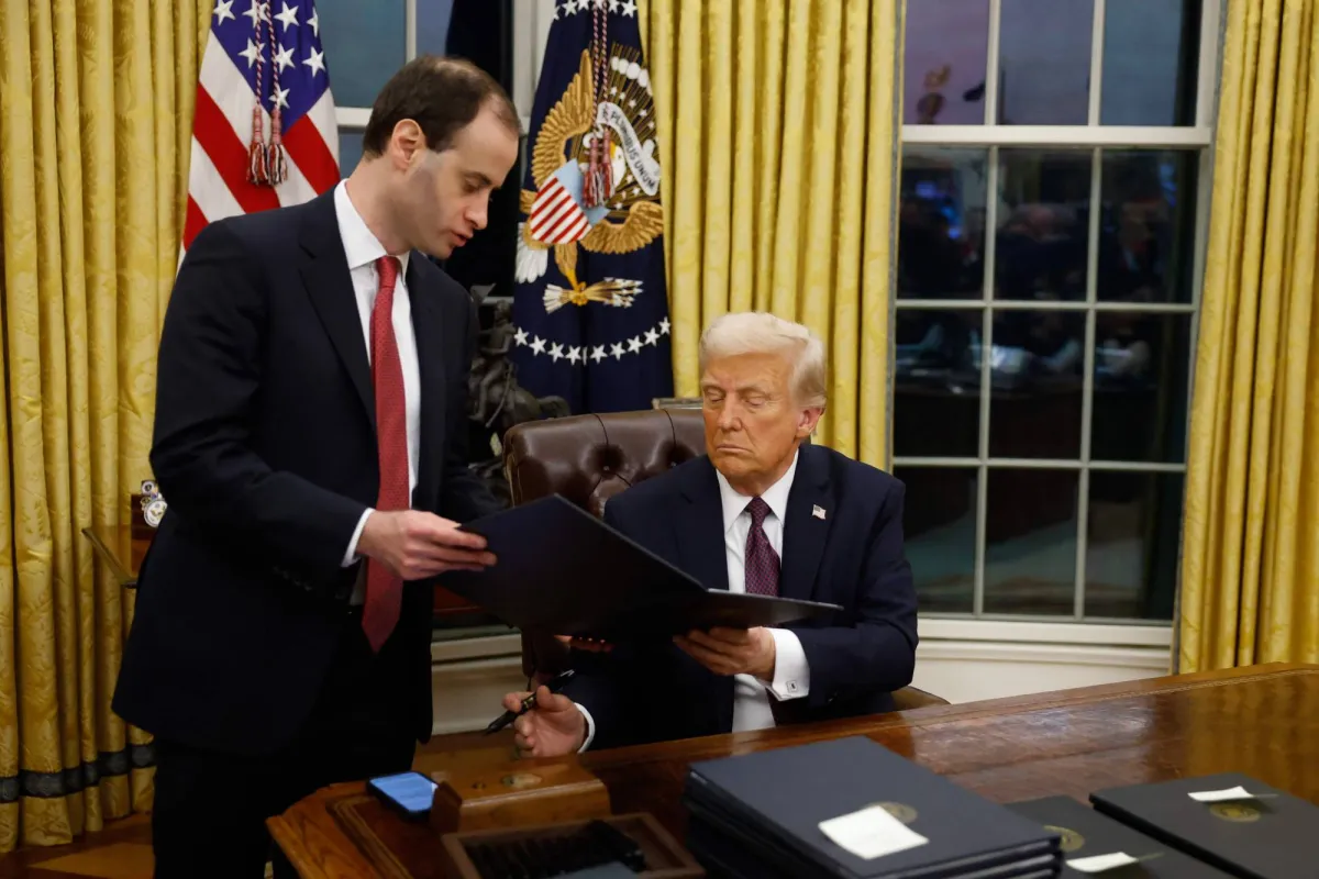 رُصد الزر الأحمر الصغير الشهير، المخفيّ داخل صندوق خشبي على مكتب ترمب بعد حفل تنصيبه، أمس (الاثنين)، وفق صحيفة «وول ستريت جورنال».