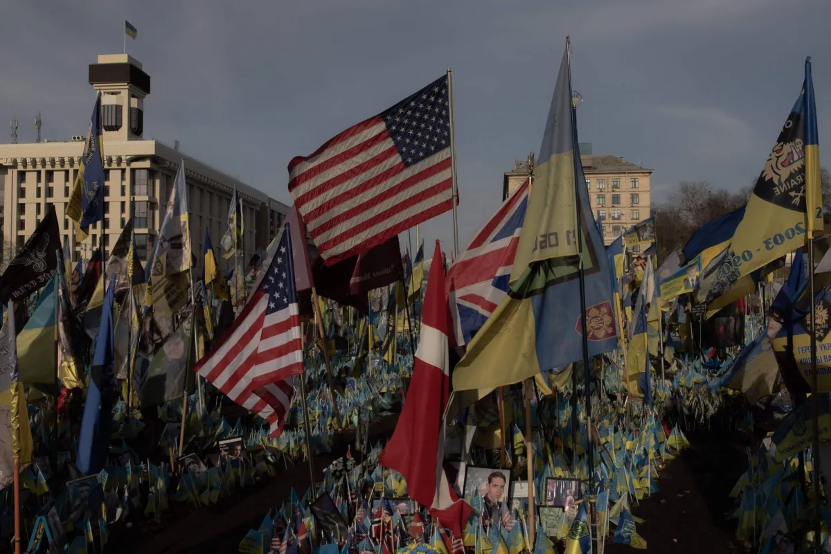 أعلام أميركية وأوكرانية عند نصب تذكاري للمقاتلين الأوكرانيين والأجانب الذين سقطوا في ساحة الاستقلال في كييف (أ.ف.ب)