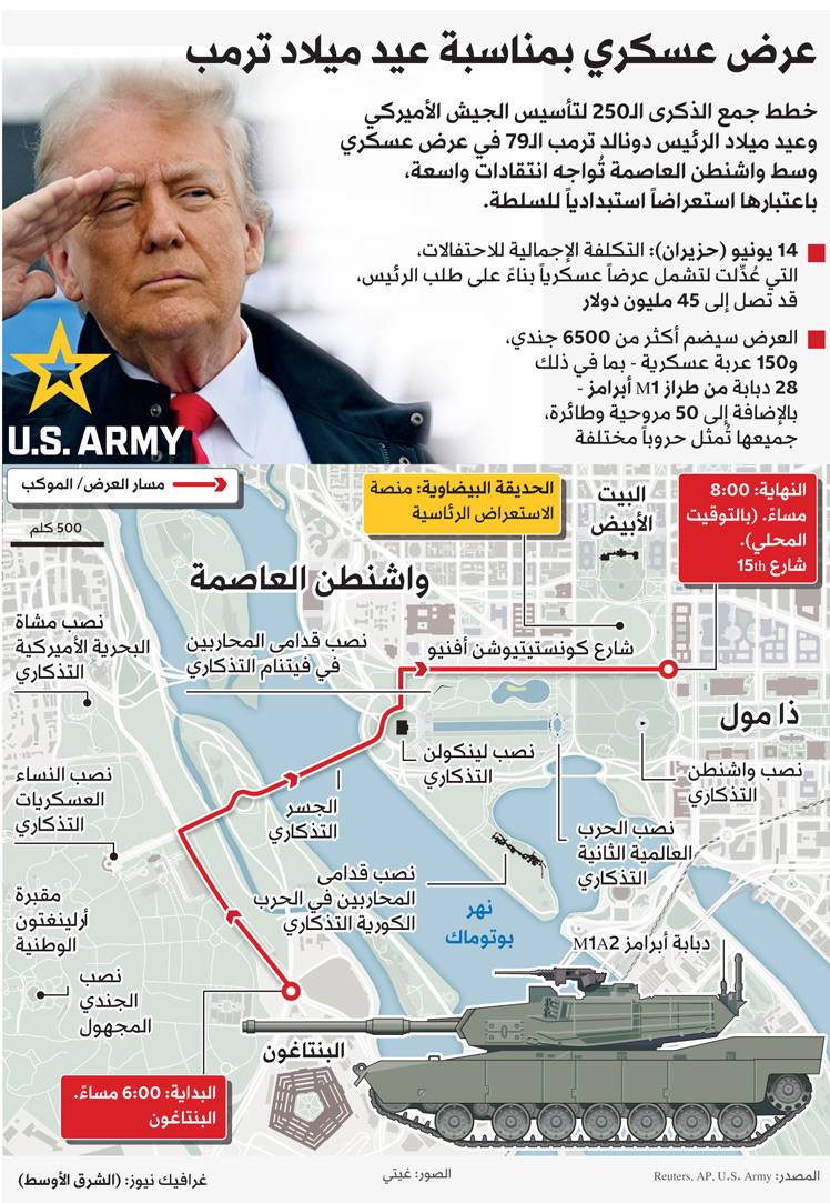 ومع ذلك، وبحسب الاستعدادات الجارية، لا يبدو أن العرض العسكري سيكون ضخماً، لكنه سيمر أمام منصة يقف عليها الرئيس ترمب مع كبار مسؤولي إدارته، بالقرب من البيت الأبيض، مساء السبت 14 يونيو، كجزء من احتفال كبير في «ناشيونال مول».