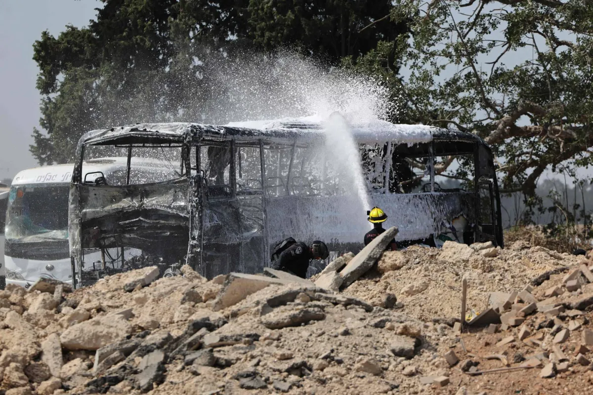 احتراق حافلة بعد سقوط صاروخ إيراني بمحطة حافلات في هرتسليا قرب تل أبيب اليوم (أ.ف.ب)