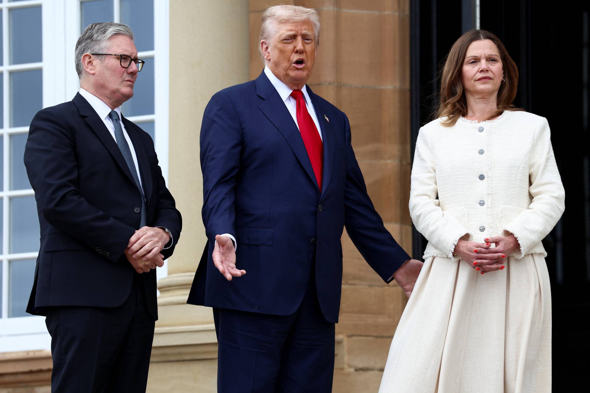 الرئيس الأميركي دونالد ترمب يلتقي رئيس الوزراء البريطاني كير ستارمر وزوجته فيكتوريا ستارمر في نادي ترمب تيرنبيري للغولف في 28 يوليو 2025 في تيرنبيري باسكوتلندا (رويترز)
