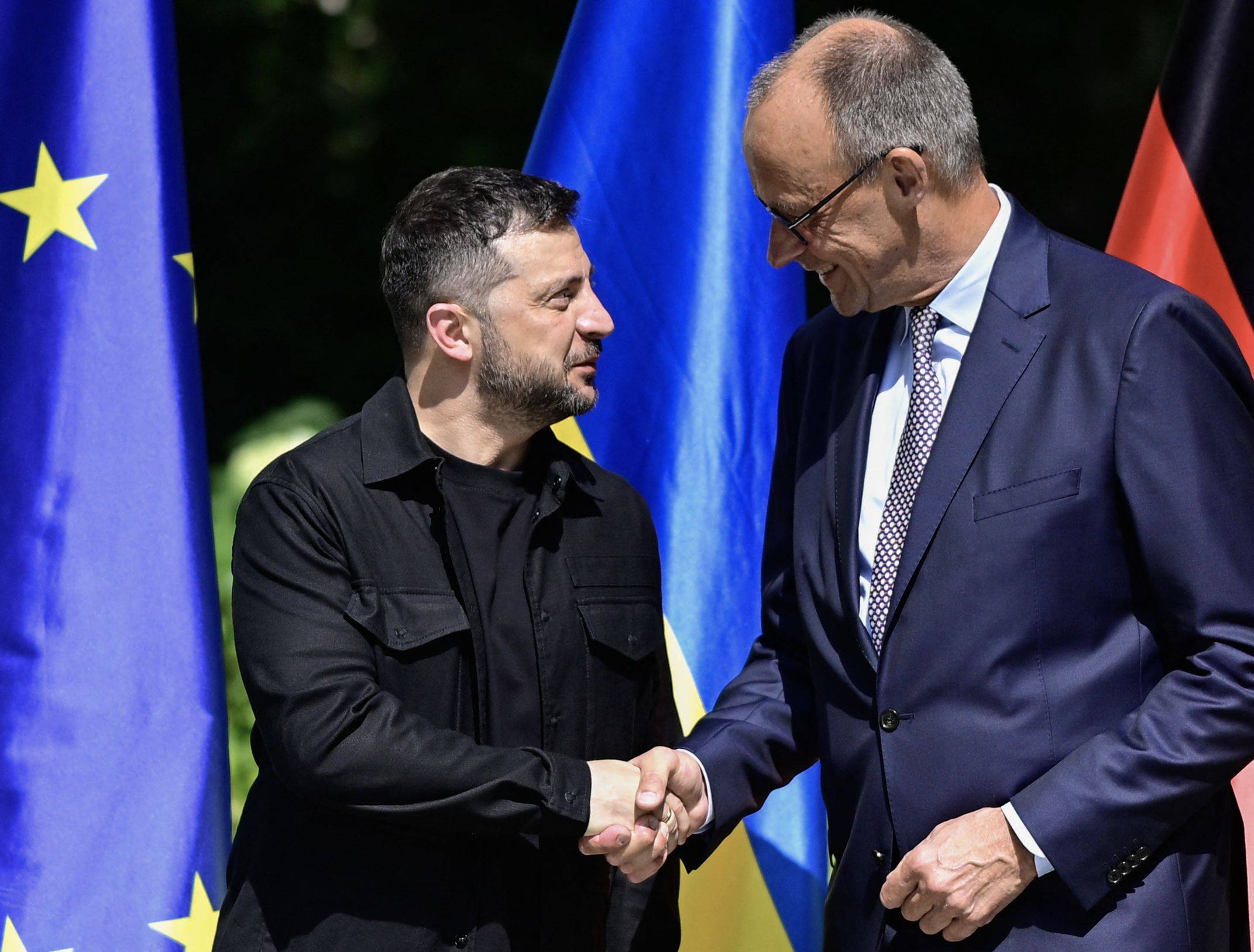 المستشار الألماني فريدريش ميرتس يرحّب بالرئيس الأوكراني فولوديمير زيلينسكي لدى وصوله إلى حديقة المستشارية في برلين للانضمام إلى مؤتمر عبر الفيديو للقادة الأوروبيين مع الرئيس الأميركي دونالد ترمب بشأن الحرب في أوكرانيا قبل القمة بين القادة الأميركيين والروس... 13 أغسطس 2025 (أ.ف.ب)