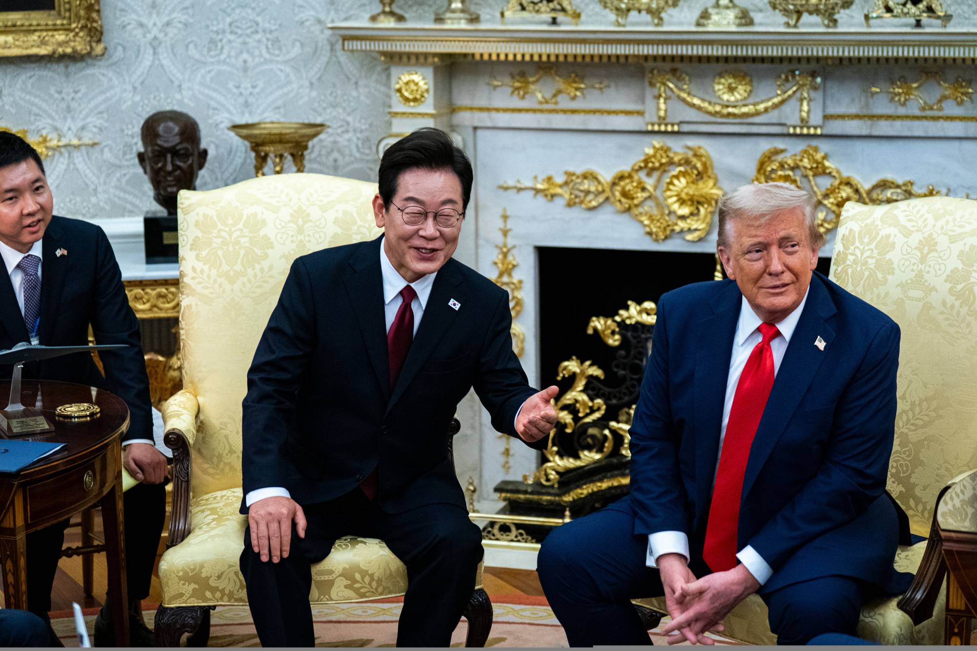 وفي لقائه الأول مع ترمب، عبّر لي، الذي انتُخب في يونيو (حزيران)، عن إعجابه بالمكتب البيضاوي «المشرق والجميل»، وأشاد بعلاقة الرئيس الأميركي بالزعيم الكوري الشمالي كيم جونغ أون.