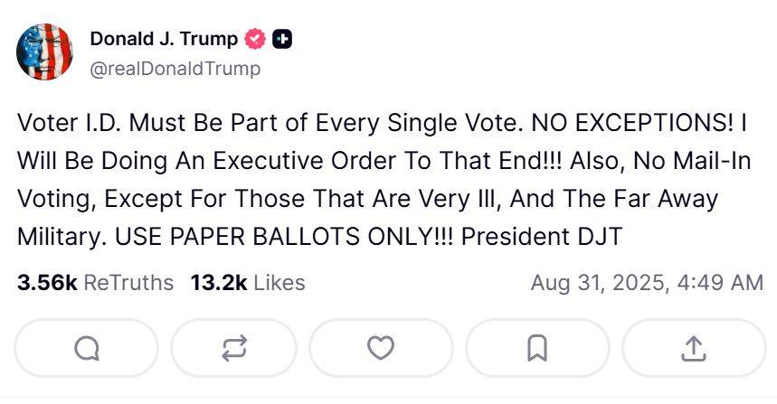 وقال ترمب على منصة «تروث سوشال»: «يجب أن تكون بطاقة هوية الناخب جزءاً من كل عملية تصويت. لا استثناءات! سأصدر أمراً تنفيذياً لتحقيق ذلك».