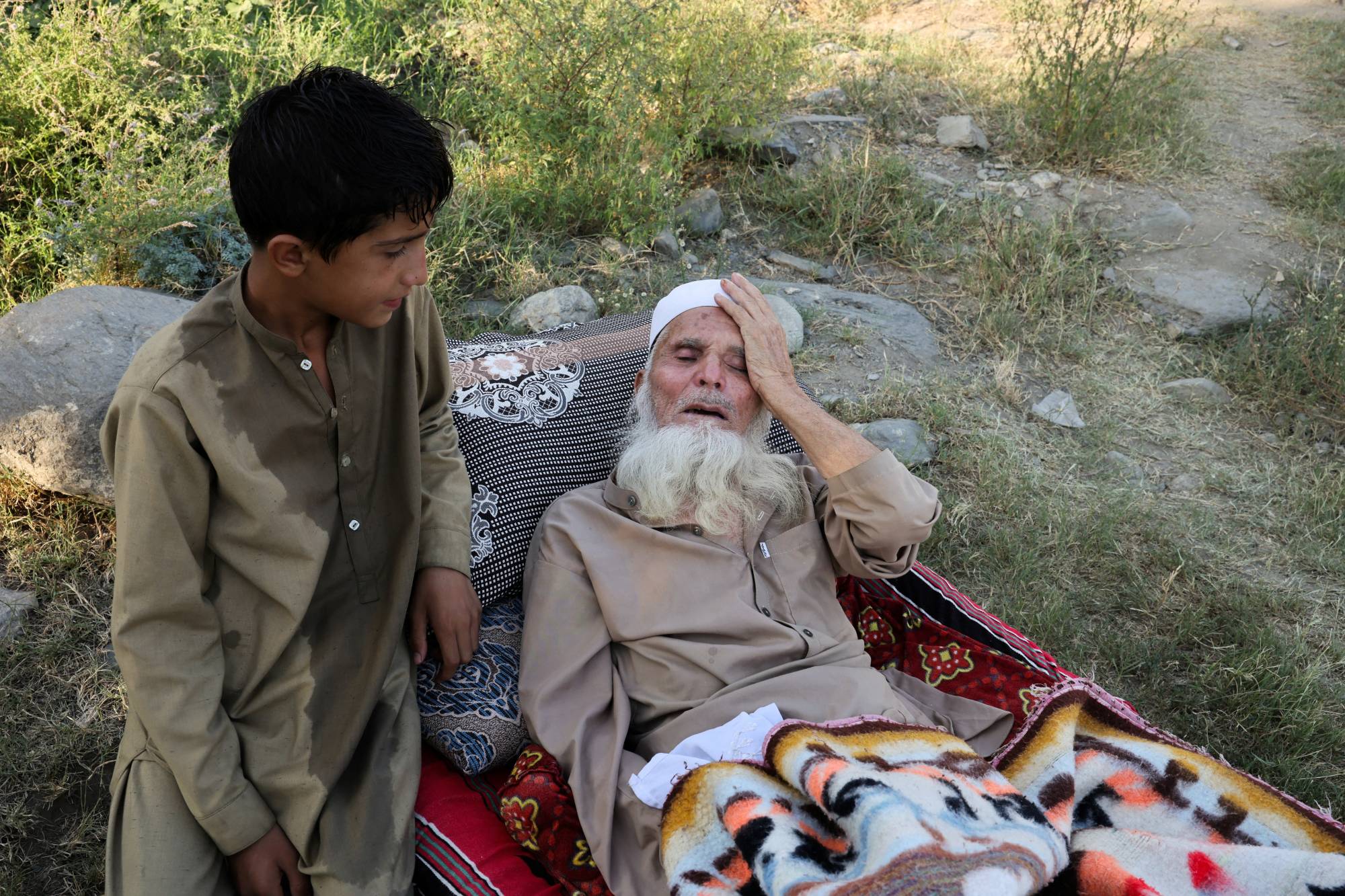 صبي يجلس بجوار جده على السرير خارج منزلهما في أعقاب الزلزال المدمر الذي ضرب قرية بامباكوت بمنطقة ديرا نور، بولاية ننكرهار في أفغانستان 6 سبتمبر 2025 (رويترز)