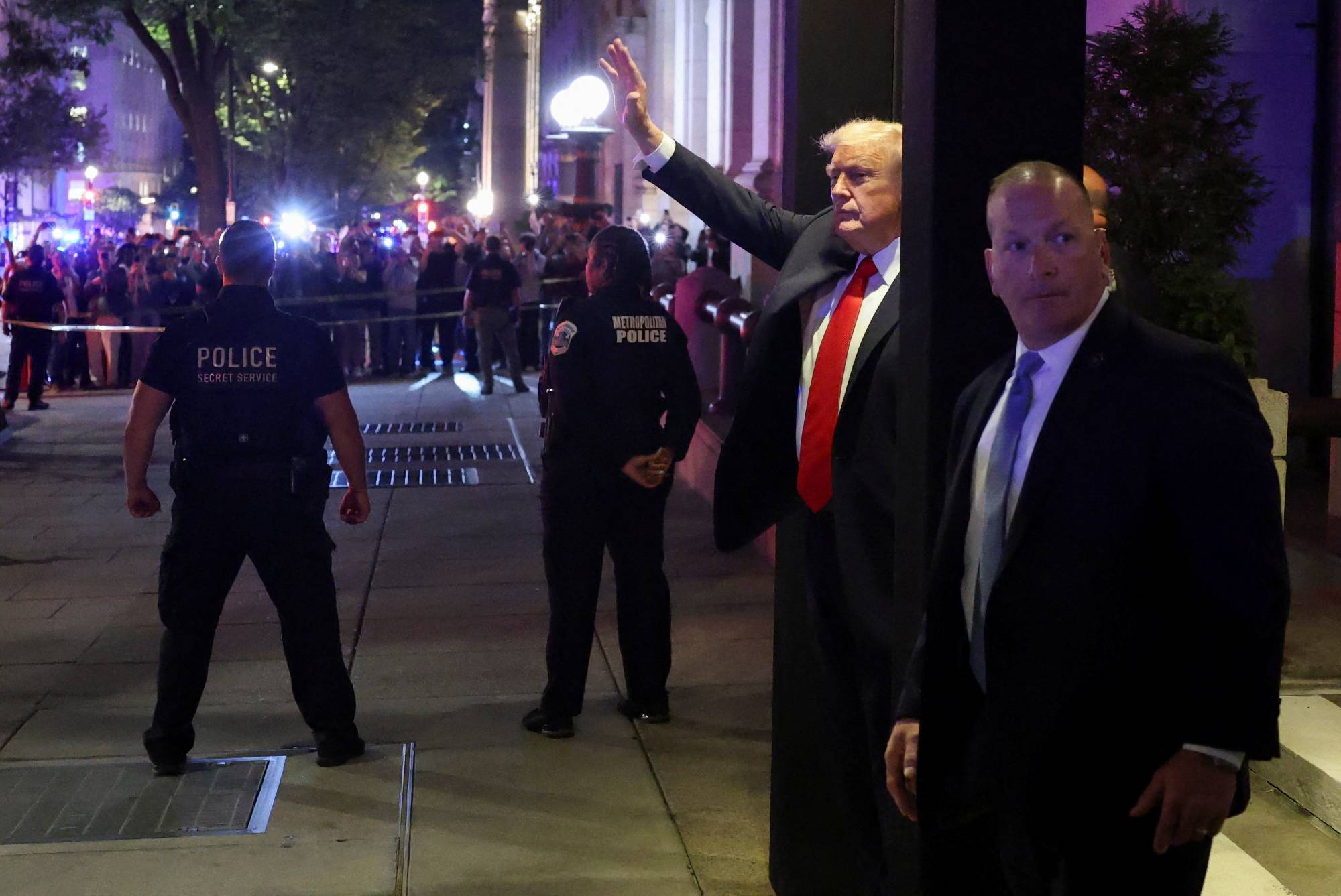 الرئيس الأميركي دونالد ترمب يلوّح بيده أثناء مغادرته مطعم جو للمأكولات البحرية بالقرب من البيت الأبيض بعد العشاء في واشنطن العاصمة (رويترز)